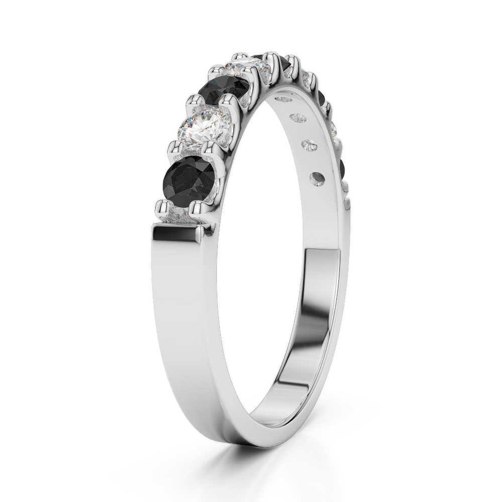 This exquisite ring features stunning black diamonds in a half eternity ring design with a split prong setting. The combination of vibrant black diamonds creates a classic and elegant piece, perfect for any occasion. Ideal for those seeking a unique and luxurious accessory, this ring is sure to stand out and add a touch of sophistication to any outfit.