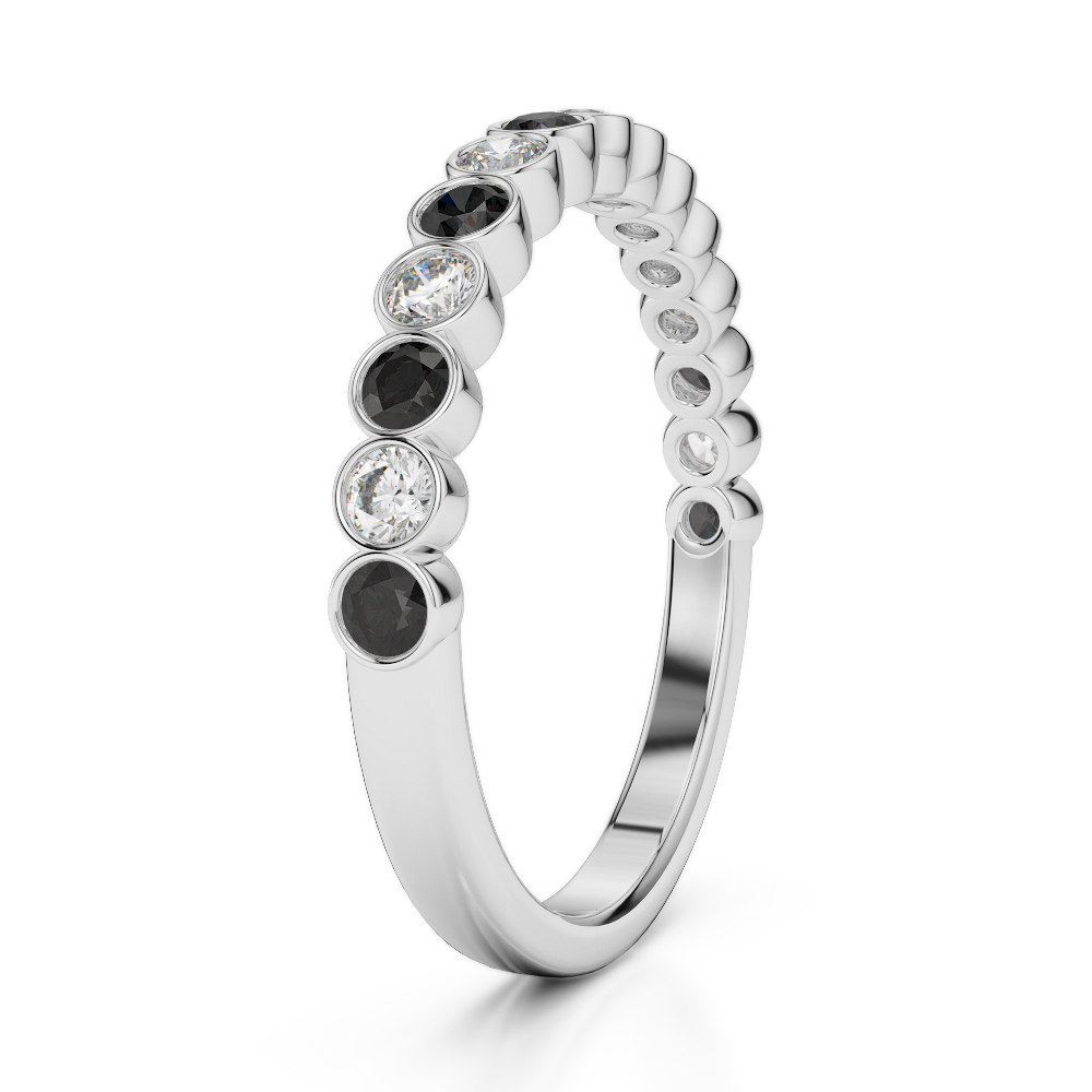 This luxurious ring features black diamonds and diamonds, creating an elegant look. The half eternity ring design, paired with a rub-over setting, adds a touch of sophistication. Ideal for special occasions or everyday wear, this eye-catching accessory is sure to impress with its dazzling gem and high-quality craftsmanship.