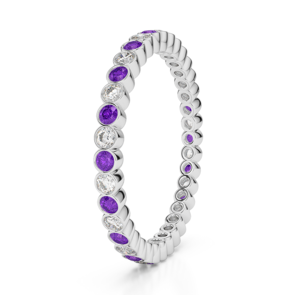 Introducing our exquisite amethyst and diamond eternity ring – a true symbol of eternal love and elegance. Crafted with meticulous attention to detail, this full eternity ring features a stunning combination of amethysts and dazzling diamonds. The bezel setting adds a touch of sophistication, securely holding the gem in place while enhancing their brilliance. This timeless piece is perfect for celebrating special occasions or as a cherished gift for a loved one.