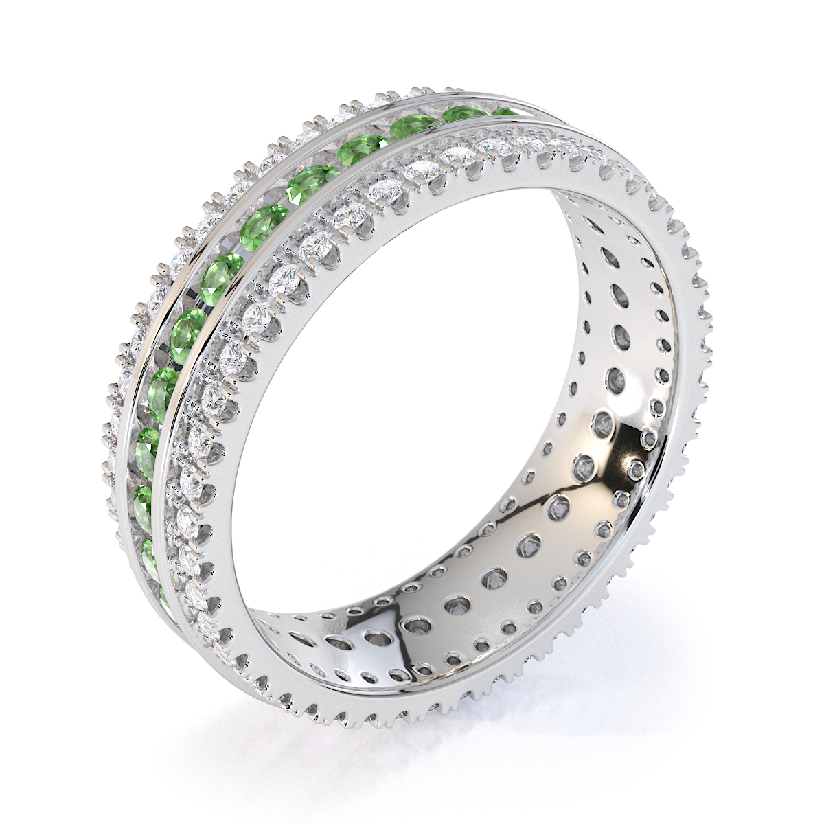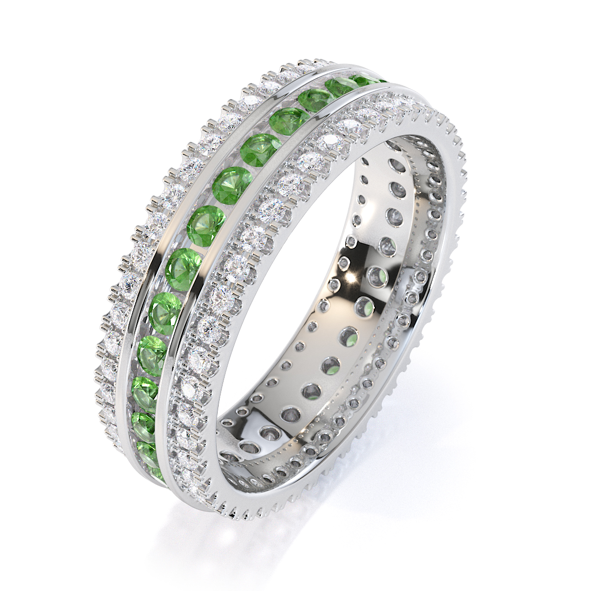This eternity ring features green tourmalines and diamonds, showcasing elegance and sophistication. It is a full-eternity ring with both split prong and channel settings, ensuring maximum security. The regal charm of the green tourmalines and the radiant sparkle of the diamonds make it a true symbol of commitment and style.