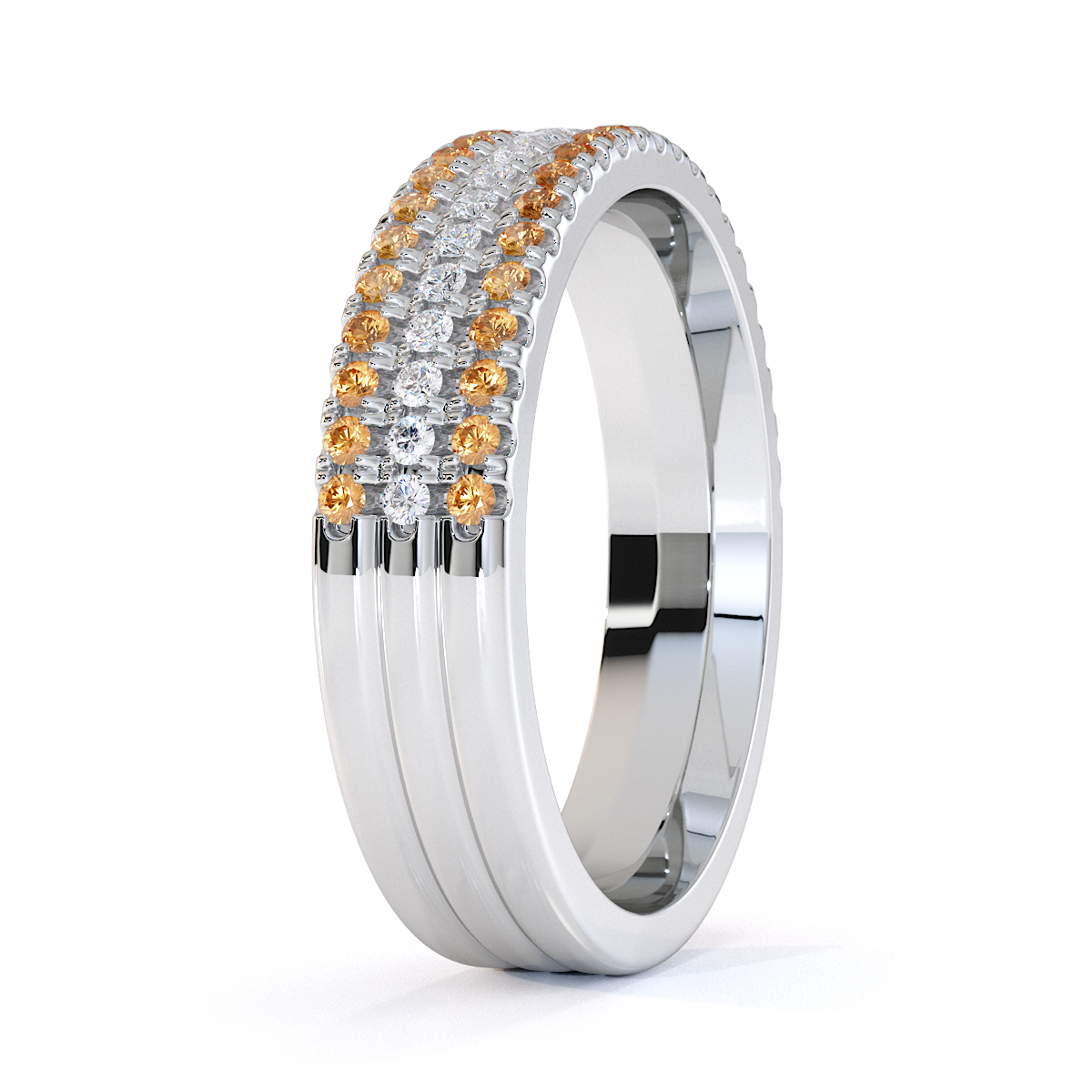 Our eternity ring is a symbol of love and commitment, featuring a half-eternity design with citrines and diamonds. The split prong setting enhances the brilliance of each gemstone, creating a mesmerising sparkle. Crafted with precision, this timeless and elegant choice is perfect for those seeking a touch of sophistication on their special day.
