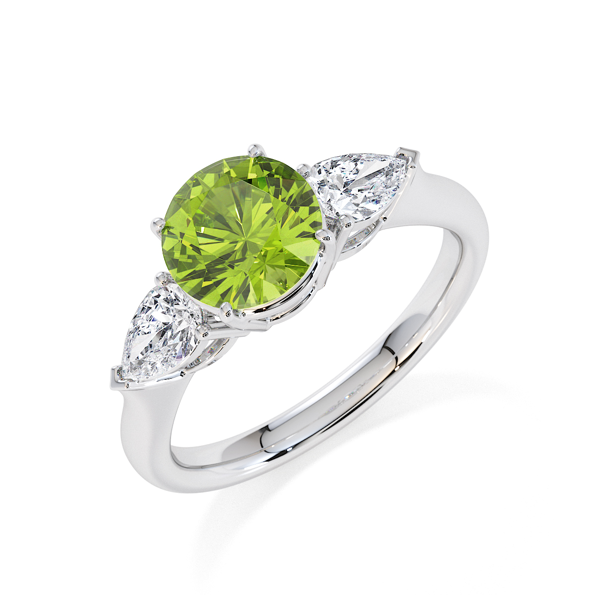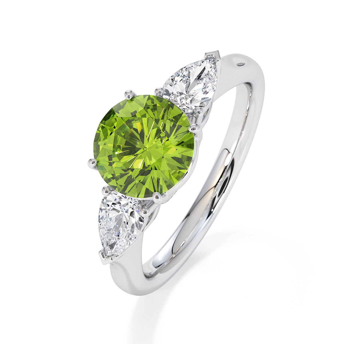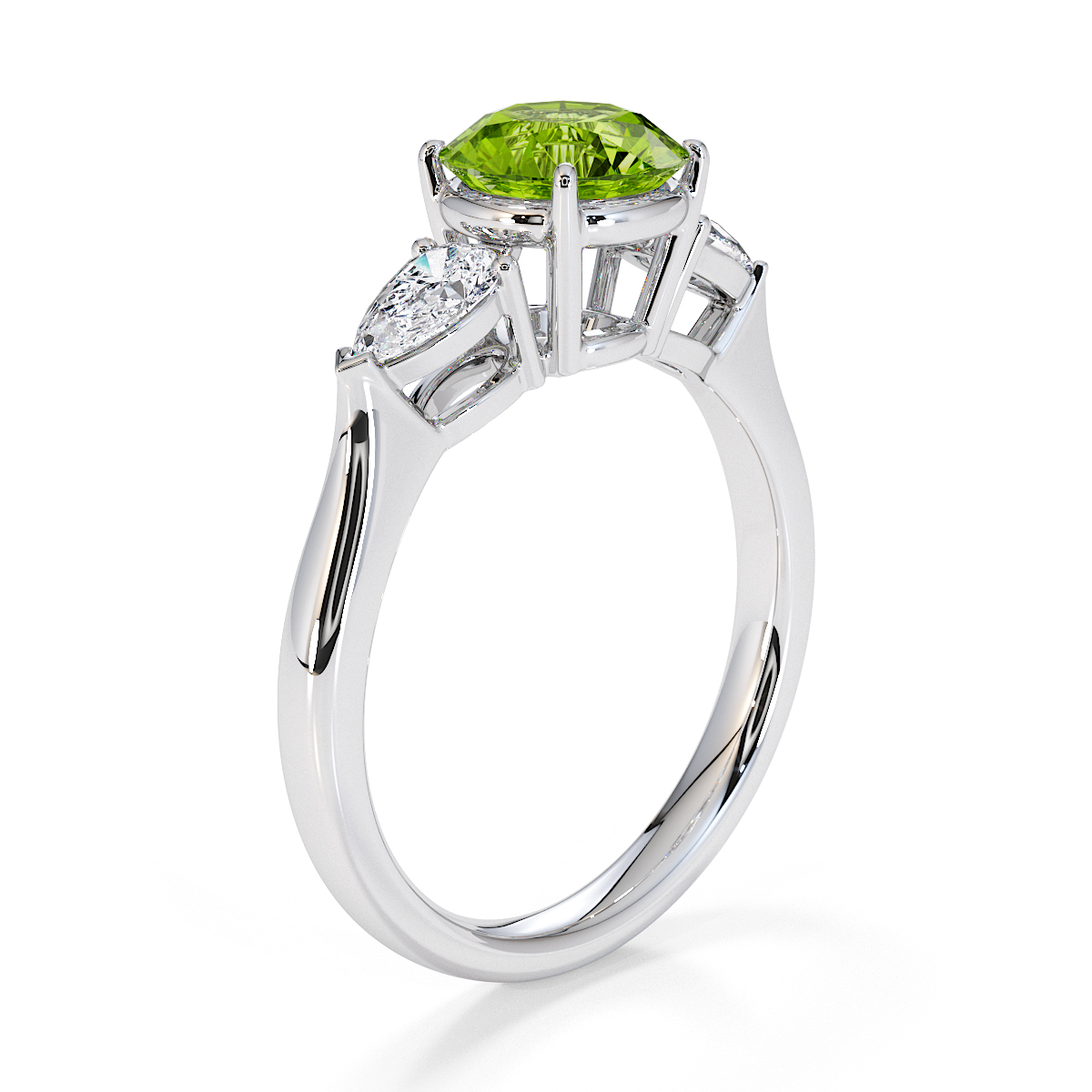 Introducing our exquisite round cut Peridot and Diamond Engagement Ring, adorned with pear-shaped side stones delicately prong-set.