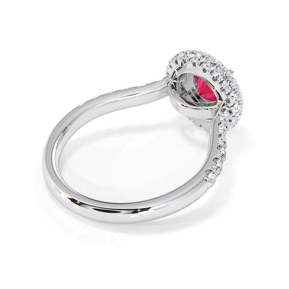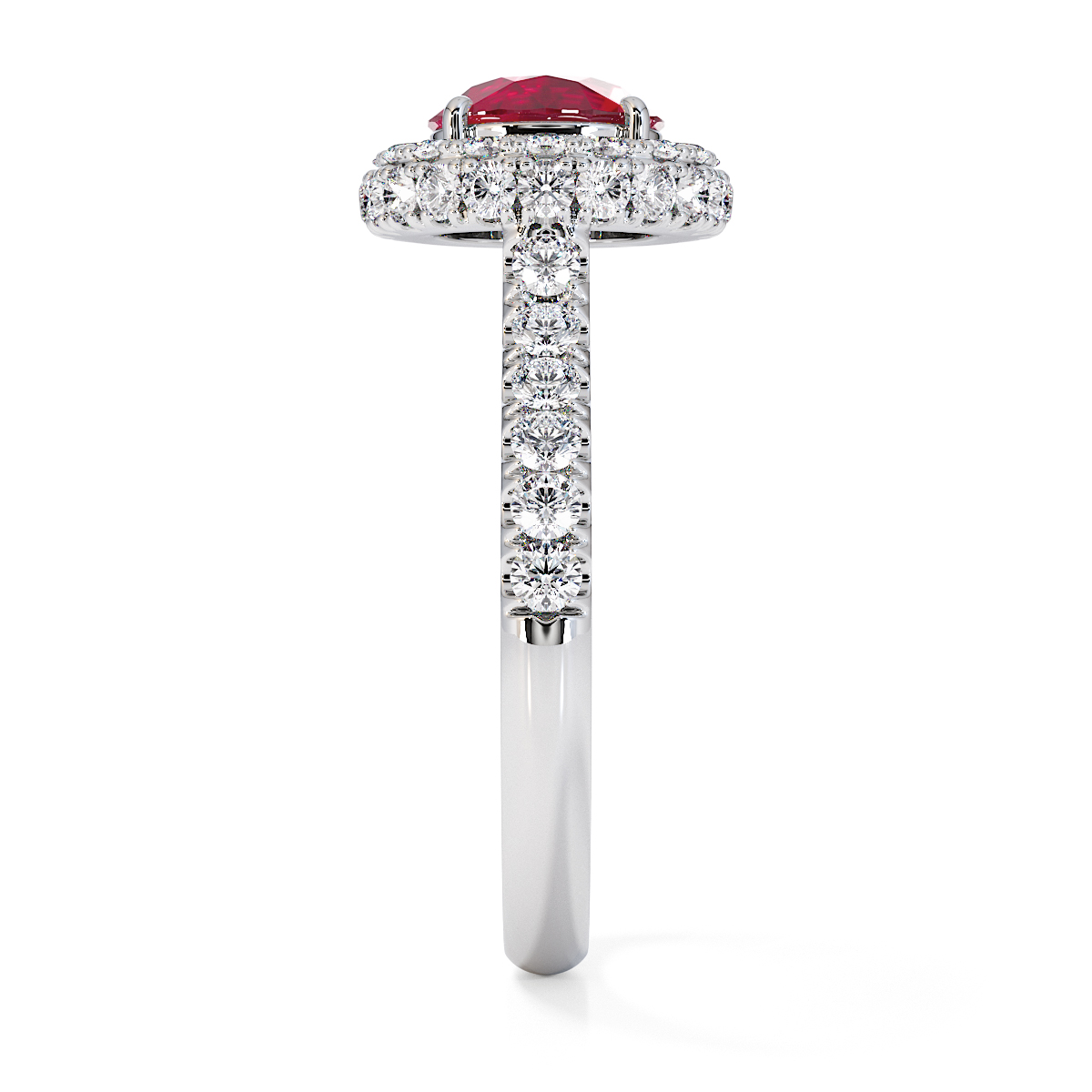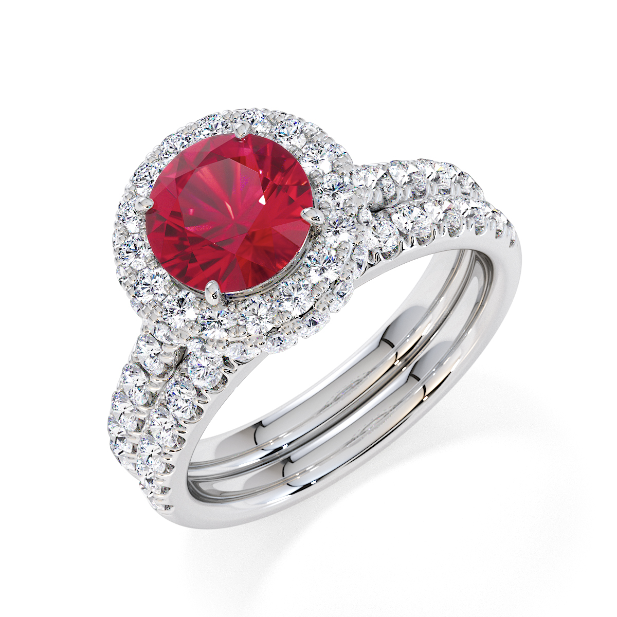 Experience timeless elegance with our exquisite Round Cut Ruby and Diamond Engagement Ring, featuring a halo of diamonds and prong-set stones. A perfect symbol of everlasting love and sophistication.