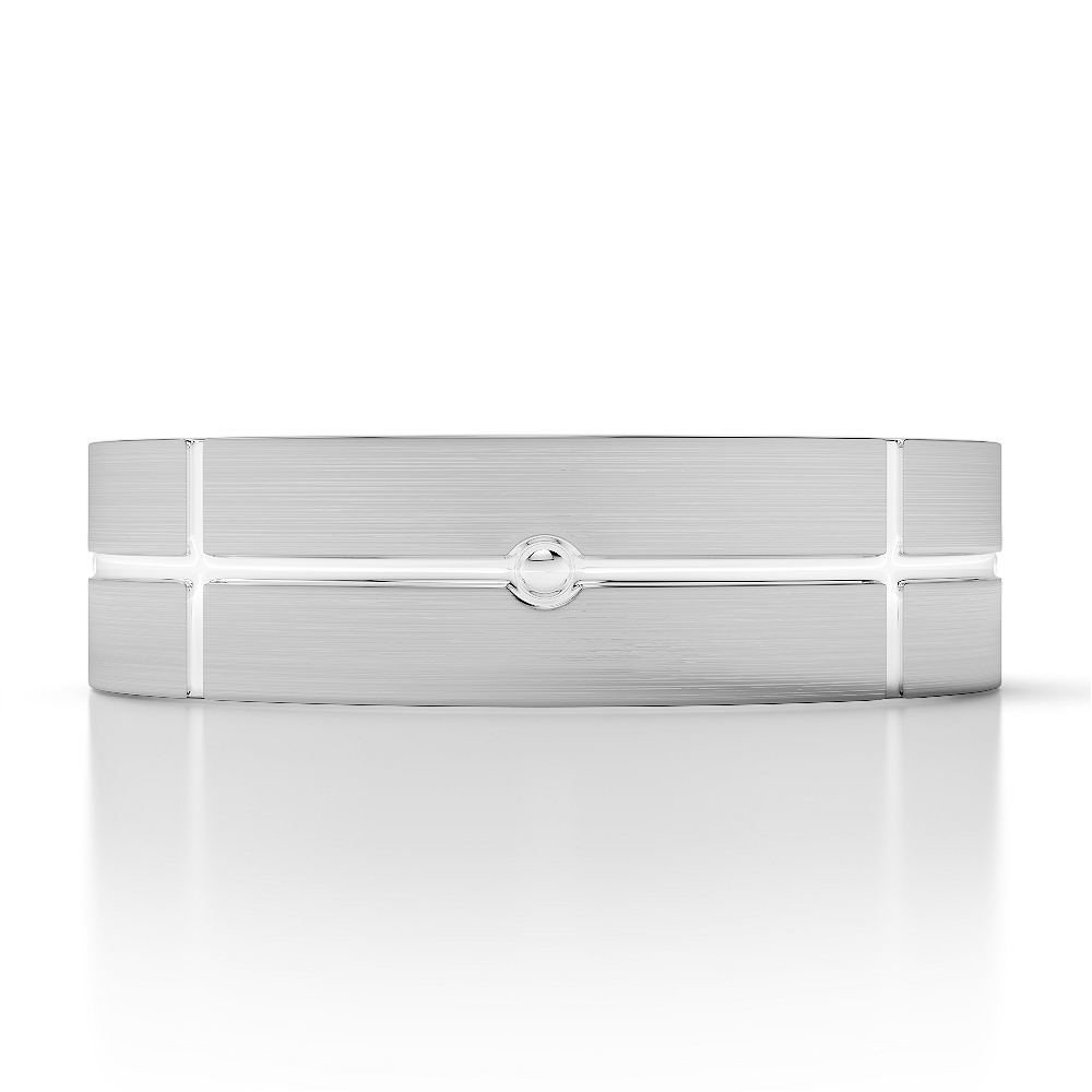 This is a men's wedding band featuring a brushed finish and two polished grooves running around the band. The center of the band is accented with a small, round diamond.