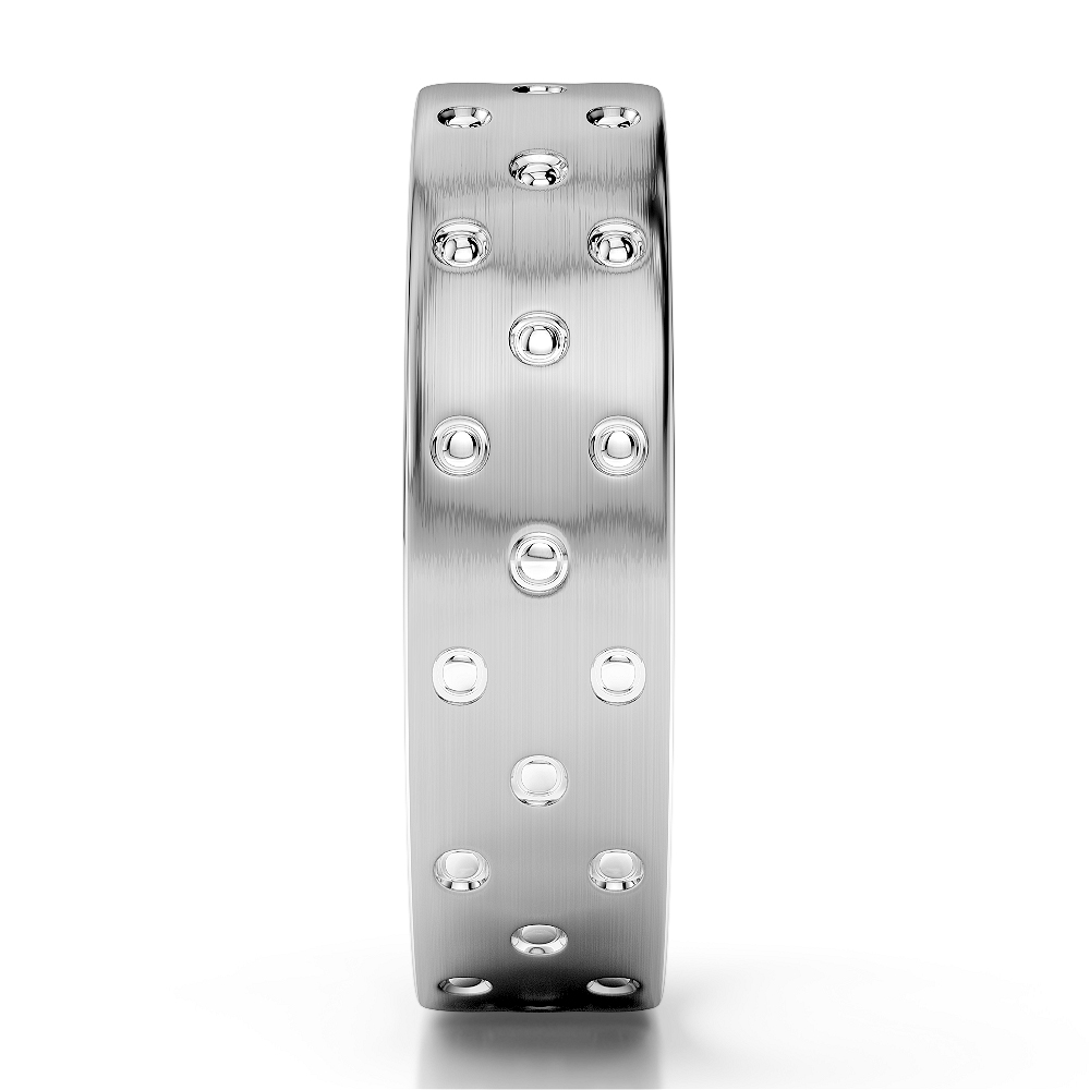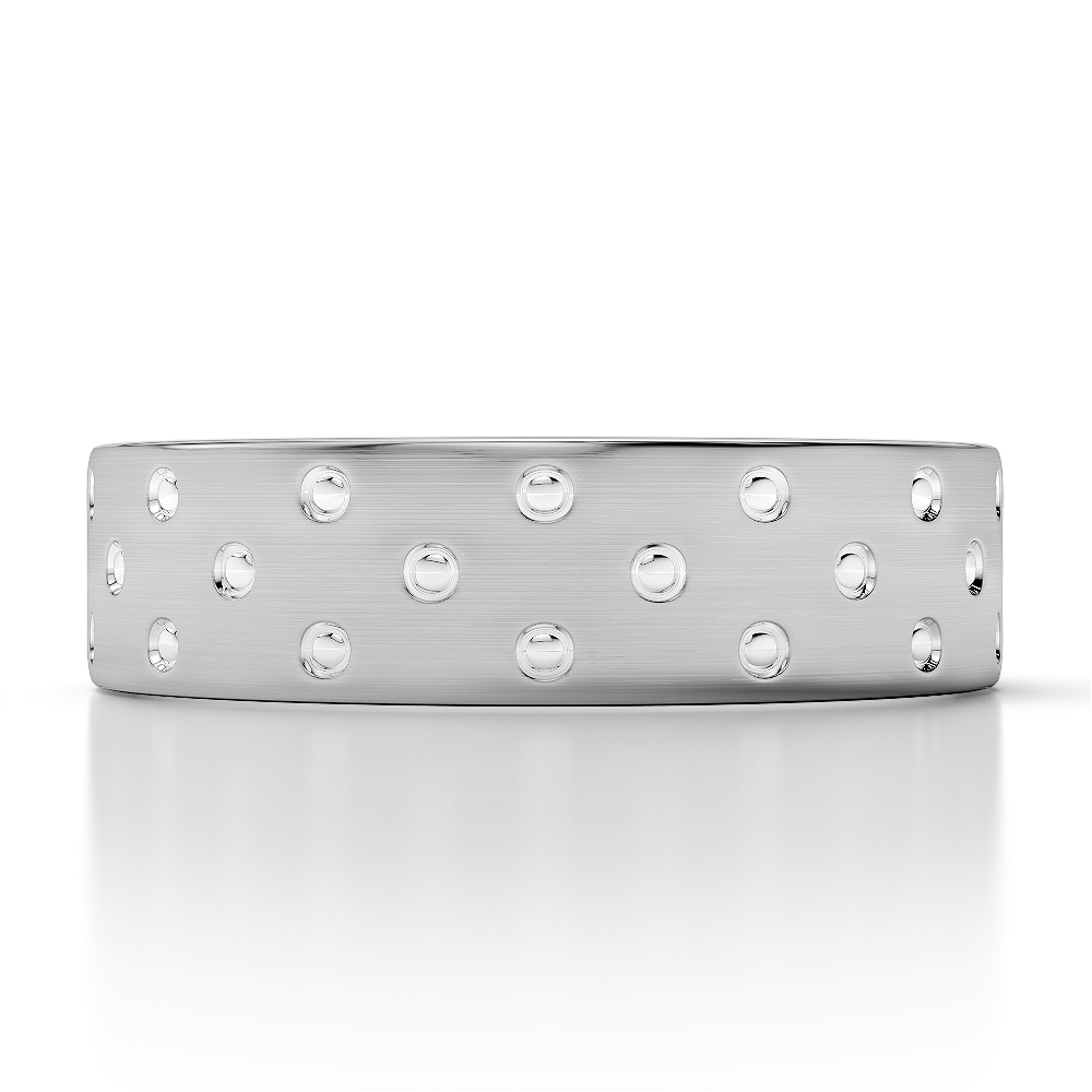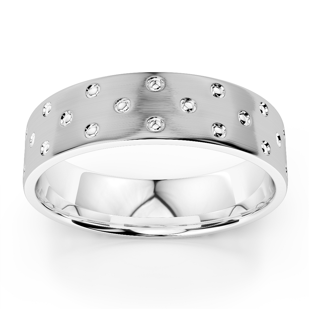 Dare to be different with the Celestial Echo Ring. This isn't your ordinary band; it's a statement. Crafted from sleek, gold/platinum metal with a modern brushed finish, this ring exudes understated sophistication. But the real magic lies in the constellation of polished indentations that grace its surface. Like stars in the night sky, these reflective details catch the light, creating a subtle yet captivating sparkle.
