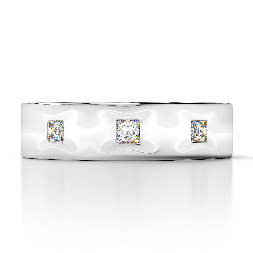 This gold/platinum wedding band features princess diamonds and a gypsy/flush set, symbolising love and commitment. It's a timeless and glamorous piece for a special day commemoration.