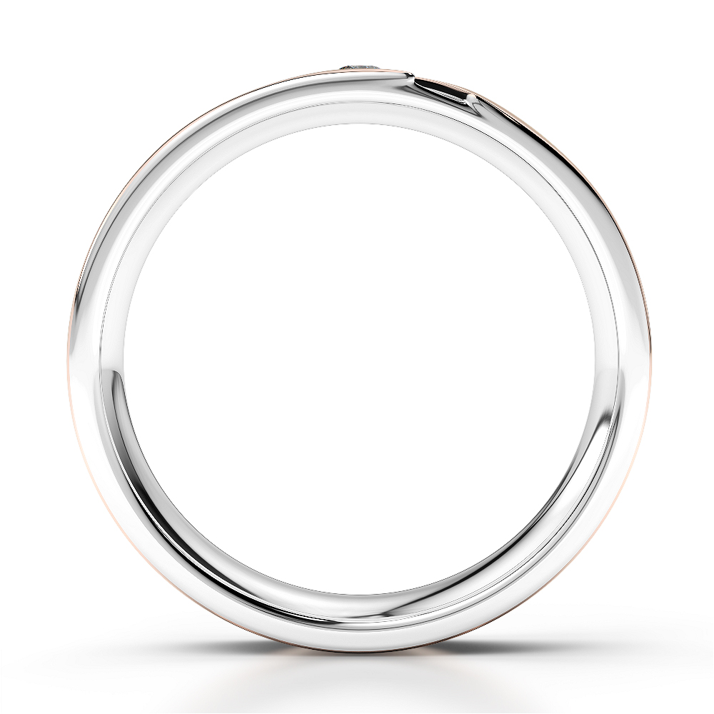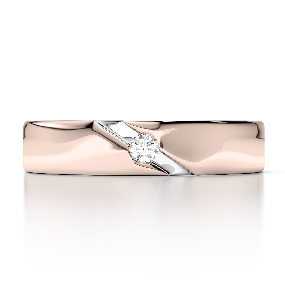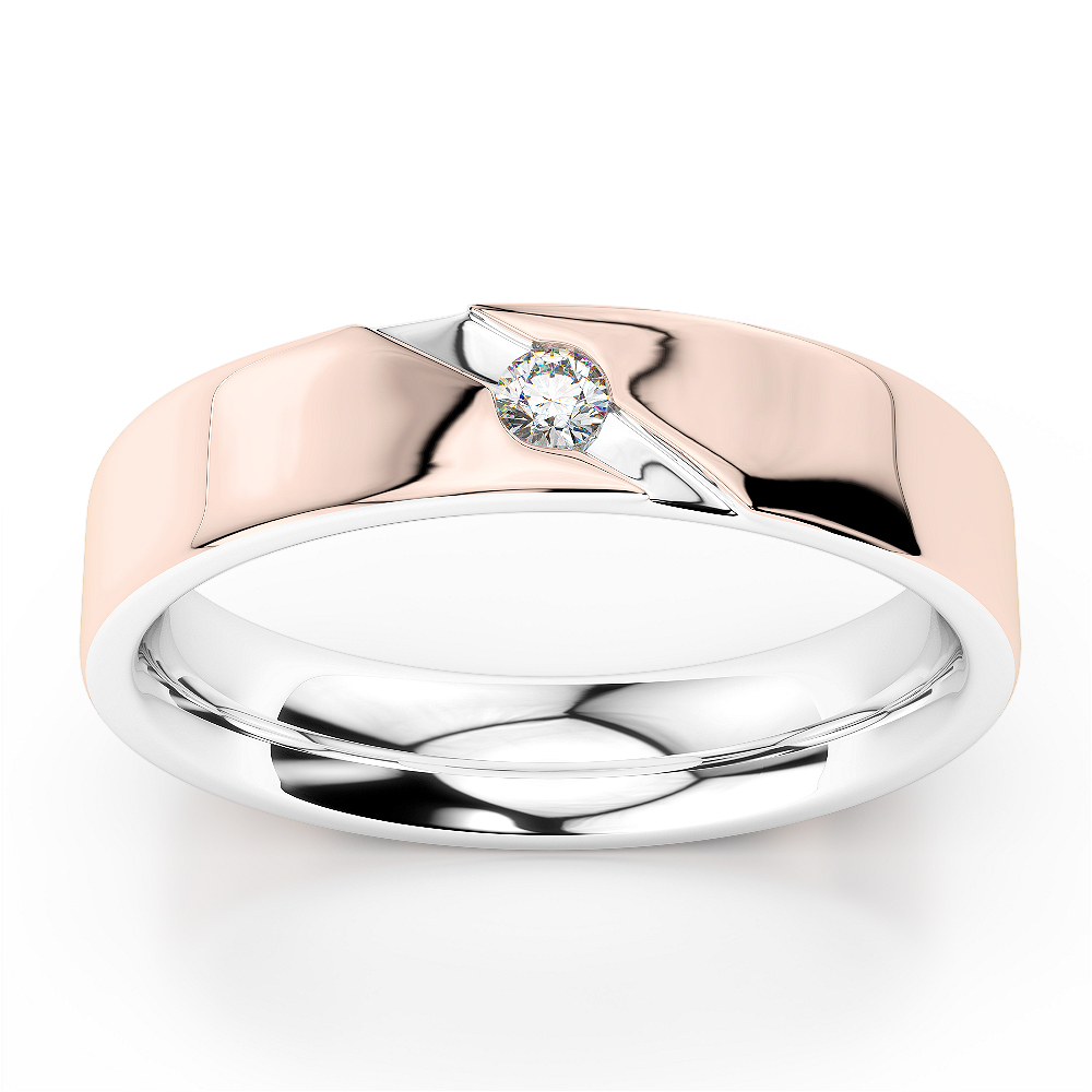 This stylish two-tone band features a sleek blend of rose gold and white gold, accentuated by a single brilliant-cut diamond nestled in a diagonal groove. Modern yet timeless, its minimalist design offers a perfect balance of elegance and character—ideal for those who appreciate understated luxury with a unique twist.