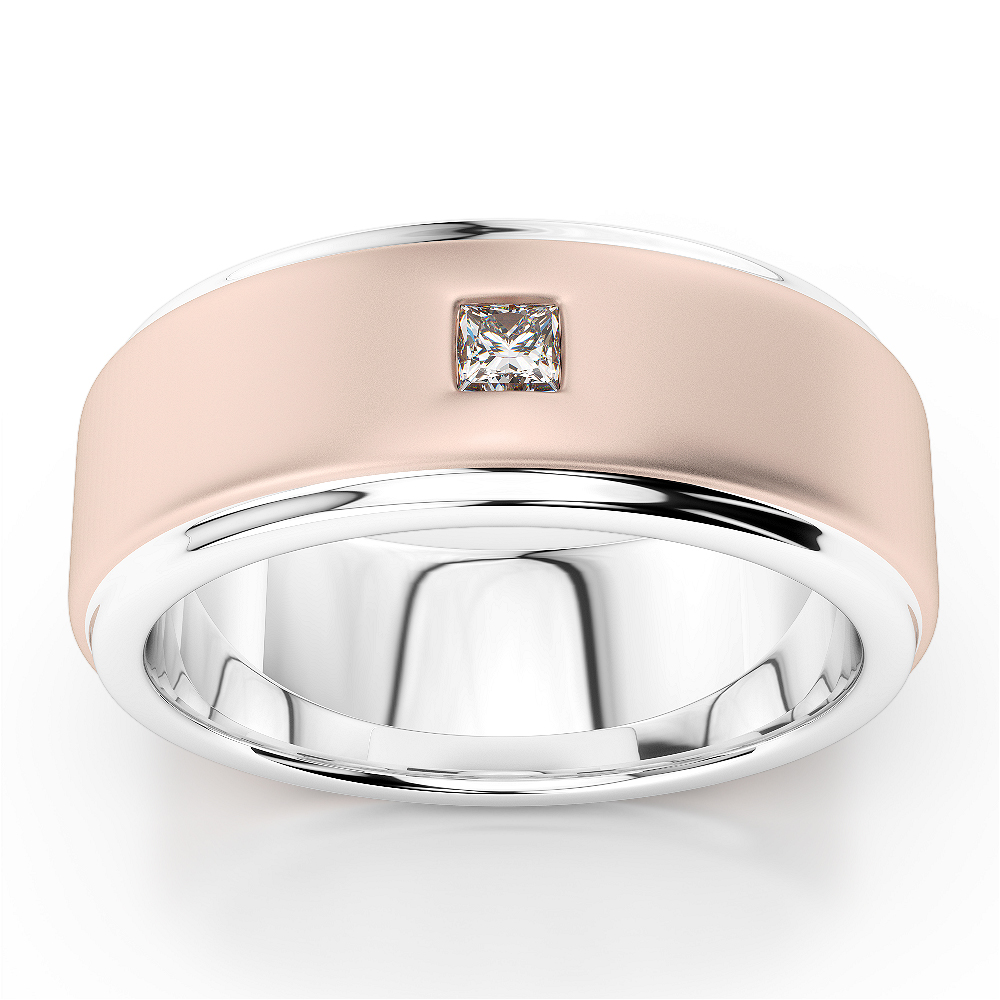 The band is crafted from a combination of rose gold and white gold, creating a striking contrast. The rose gold portion of the band has a brushed finish, giving it a matte and sophisticated look. A single, square-cut diamond is set into the center of the band, adding a touch of elegance.