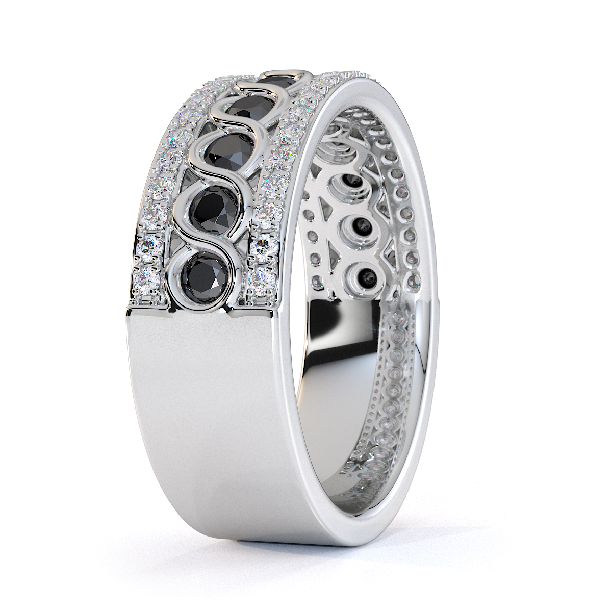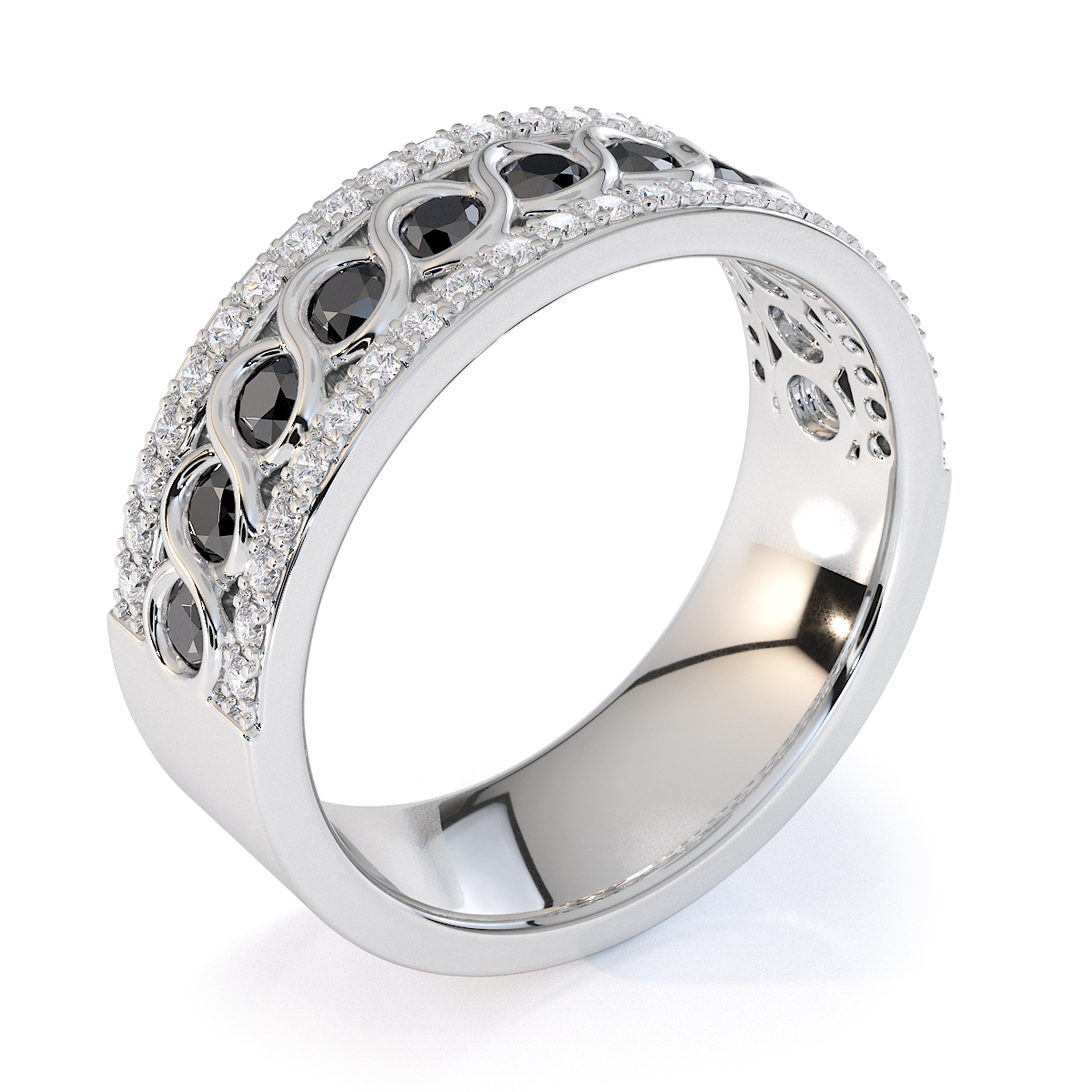 Our eternity ring, featuring black diamonds and diamonds, is a full-eternity design that combines elegance and sophistication. Crafted with precision, it features both split prong and bezel settings for secure stone placement.