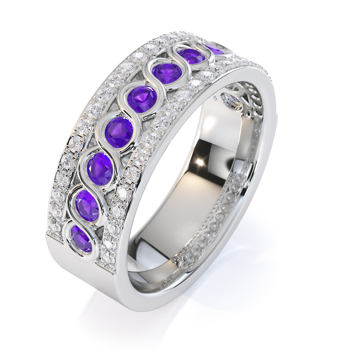 Our eternity ring, featuring amethysts and diamonds, is a full-eternity design that combines elegance and sophistication. Crafted with precision, it features both split prong and bezel settings for secure stone placement.