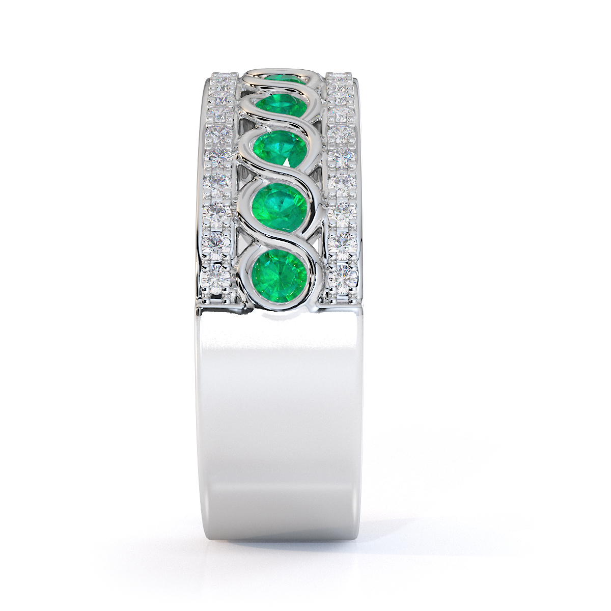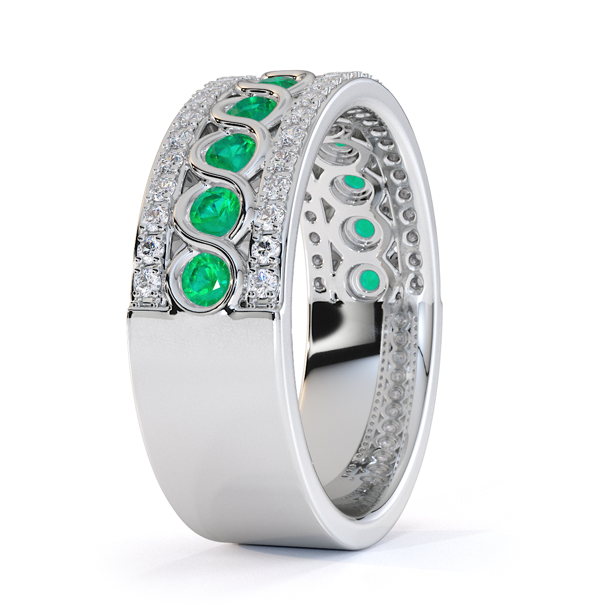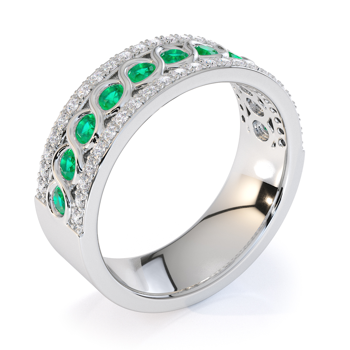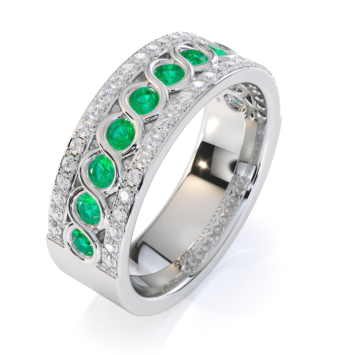 Our eternity ring, featuring emeralds and diamonds, is a full-eternity design that combines elegance and sophistication. Crafted with precision, it features both split prong and bezel settings for secure stone placement.
