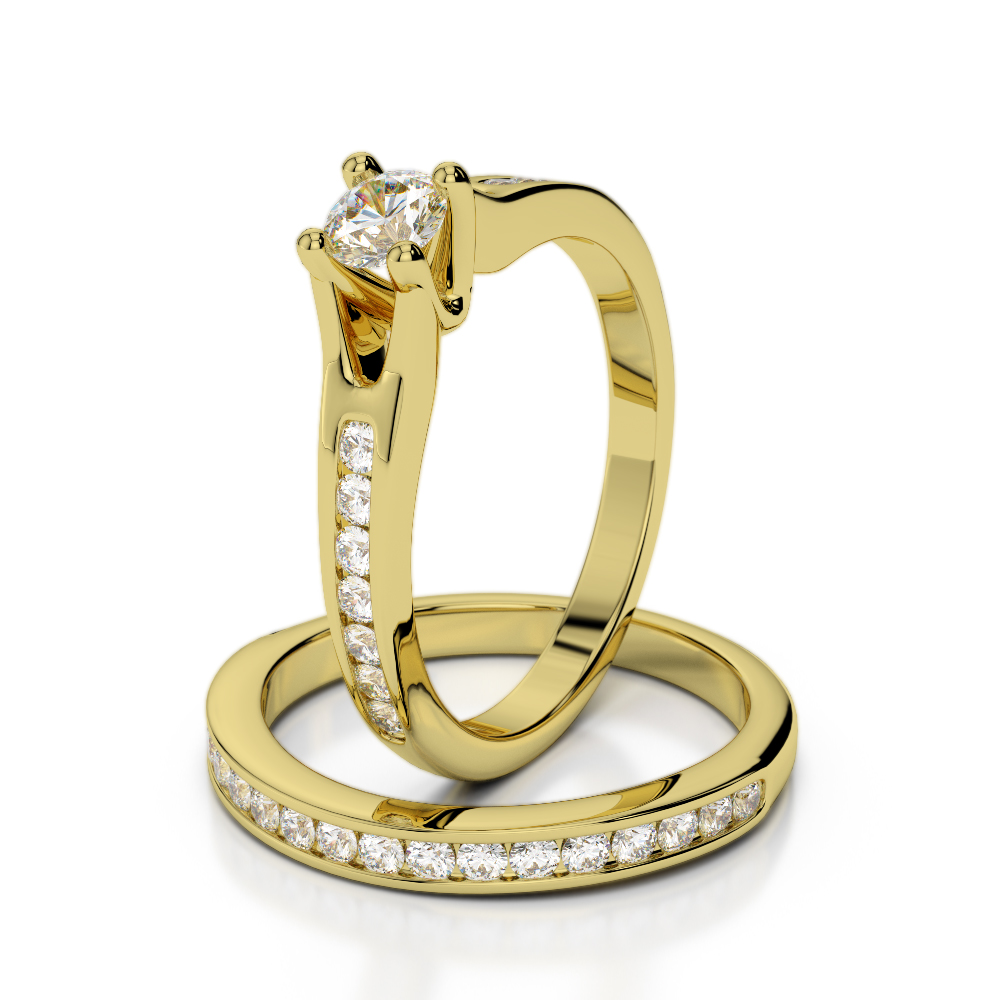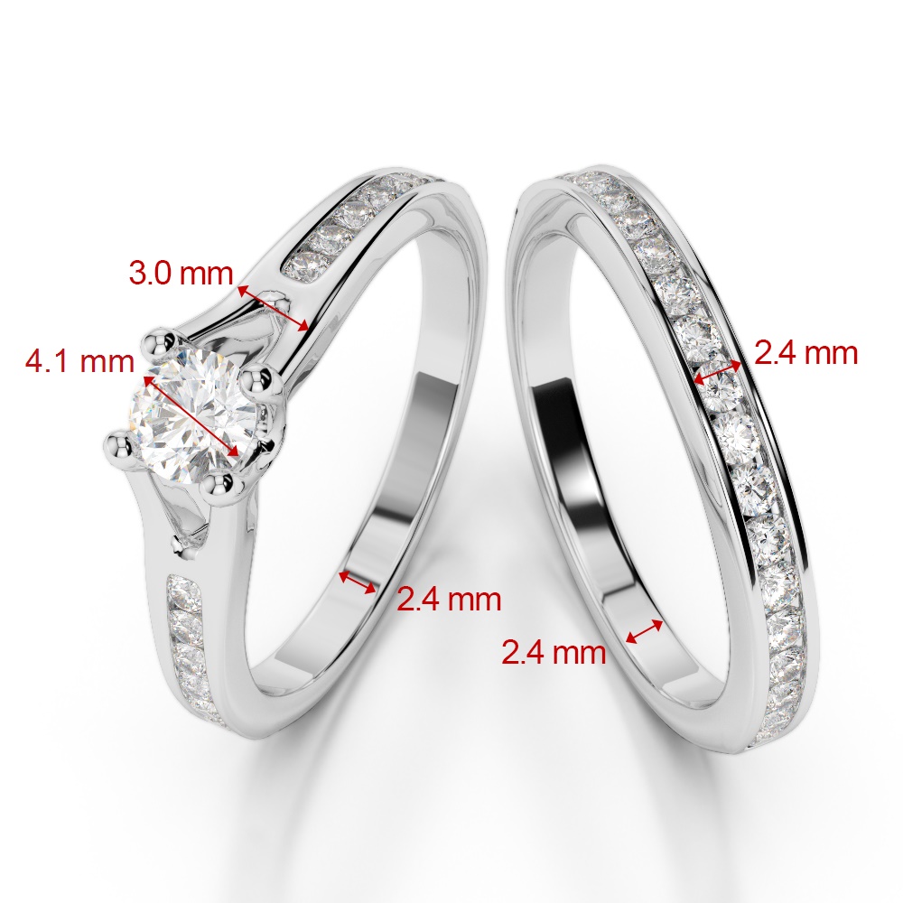 These stunning diamond bridal set rings feature round, brilliant-cut diamonds that sparkle and shine with every hand movement. Handcrafted by experienced jewellery craftsmen, these diamonds are chosen from the finest in the world. The rings are designed with prong and channel settings for enduring beauty. The naturally mined conflict-free diamonds add comfort and style to your look, making them a timeless choice for engagement and wedding rings. These rings are sure to be treasured and loved for many years.