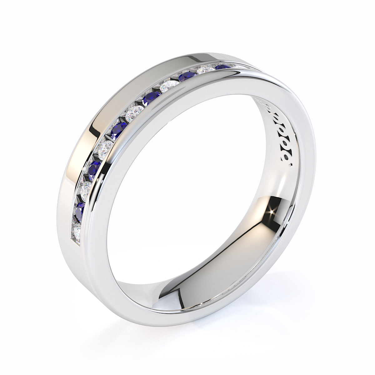 Our eternity ring is a stunning symbol of eternal love and commitment, featuring a half-eternity design of blue sapphires and diamonds. Crafted with precision, the channel setting enhances the brilliance of each gemstone, creating a mesmerizing sparkle. This timeless and luxurious piece is perfect for those seeking a cherished treasure to last forever.