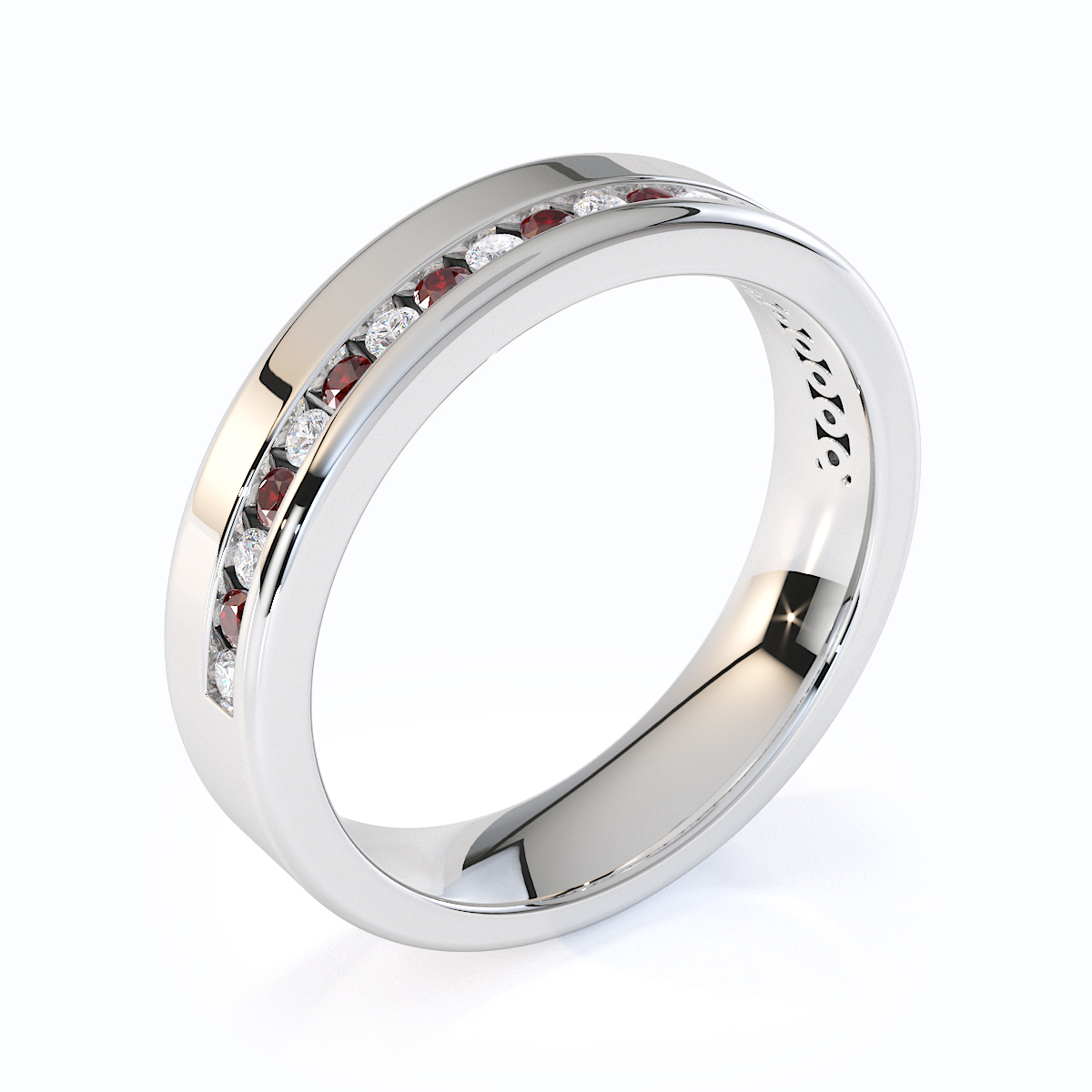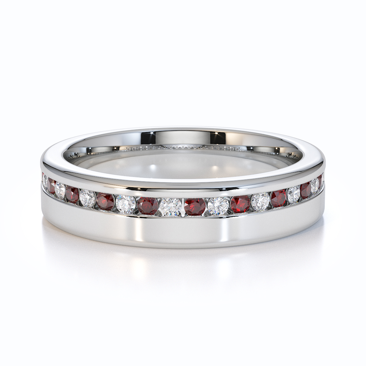 Our eternity ring is a stunning symbol of eternal love and commitment, featuring a half-eternity design of garnets and diamonds. Crafted with precision, the channel setting enhances the brilliance of each gemstone, creating a mesmerizing sparkle. This timeless and luxurious piece is perfect for those seeking a cherished treasure to last forever.