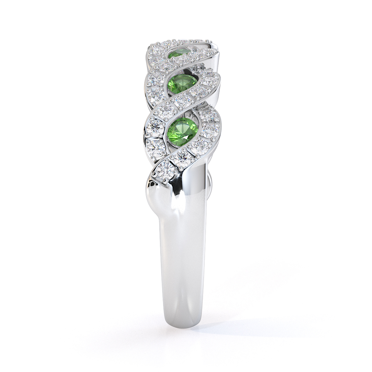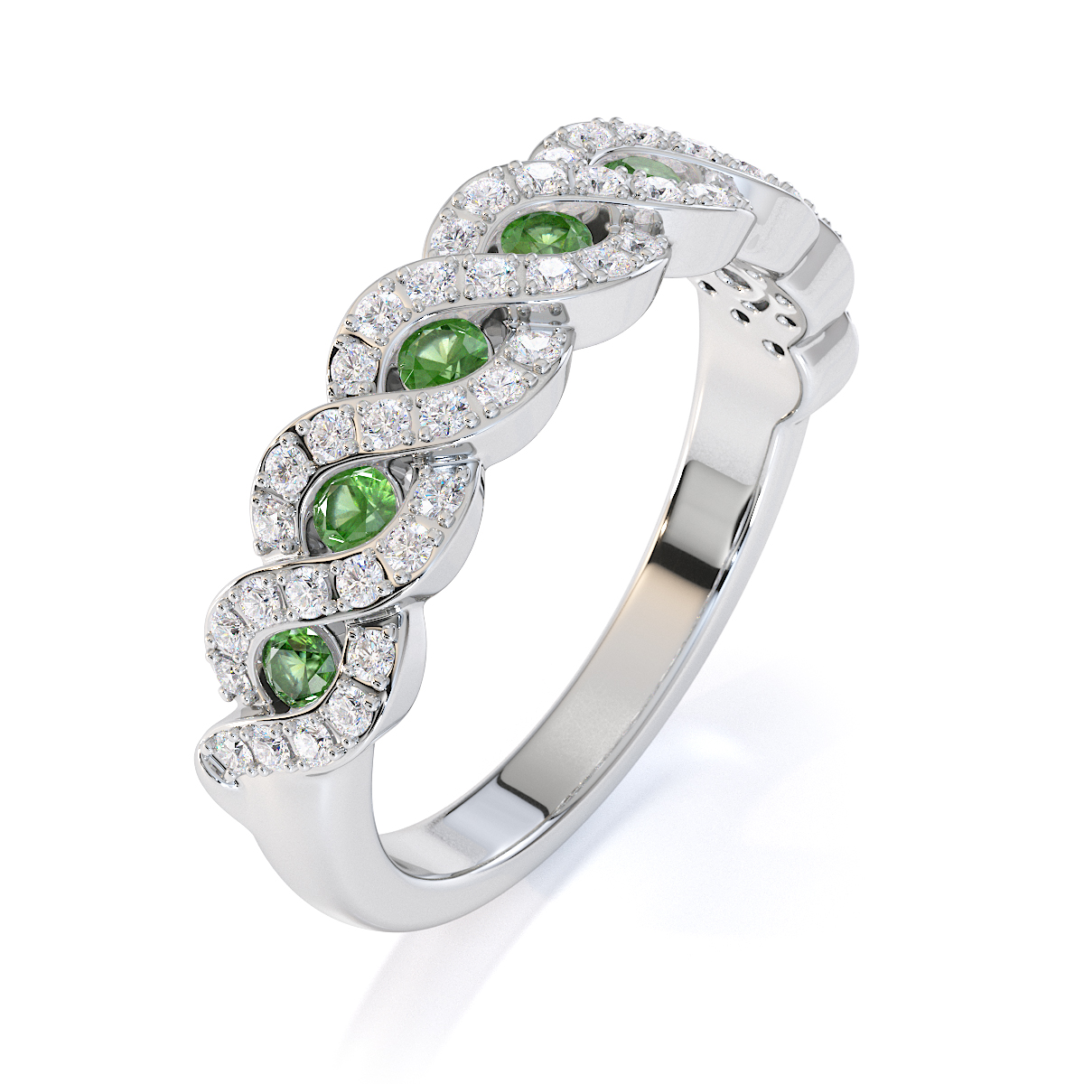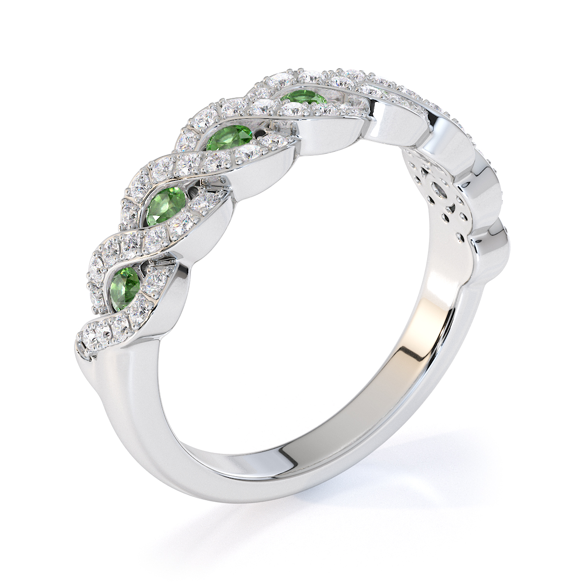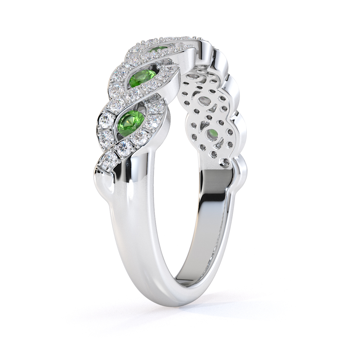 This half eternity ring features green tourmalines, symbolising elegance and sophistication. Crafted with precision, it combines prong and channel settings to securely hold the stones. The vibrant green hues captivate and mesmerise, creating a timeless piece that blends classic design with modern style — a must-have for any jewellery collection.