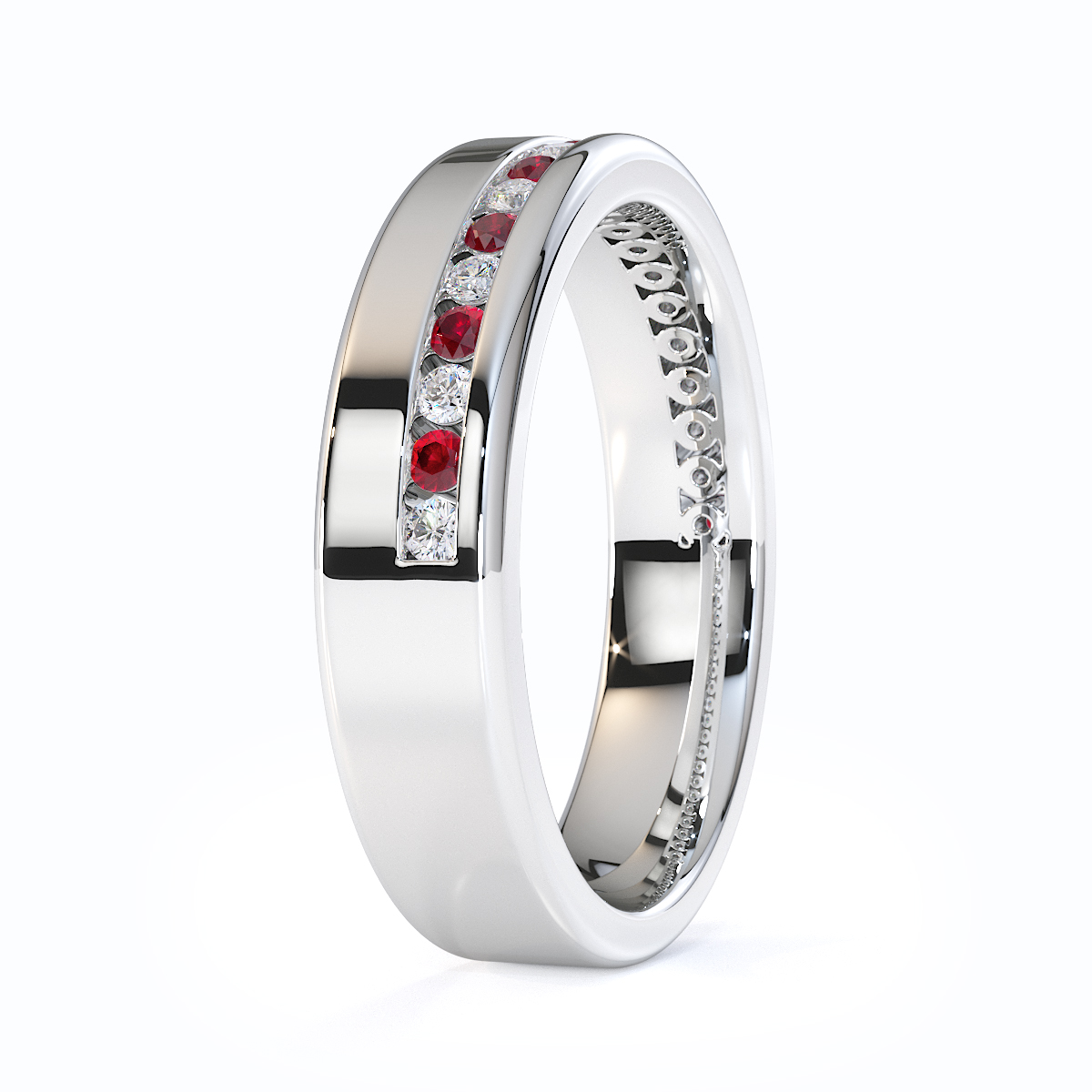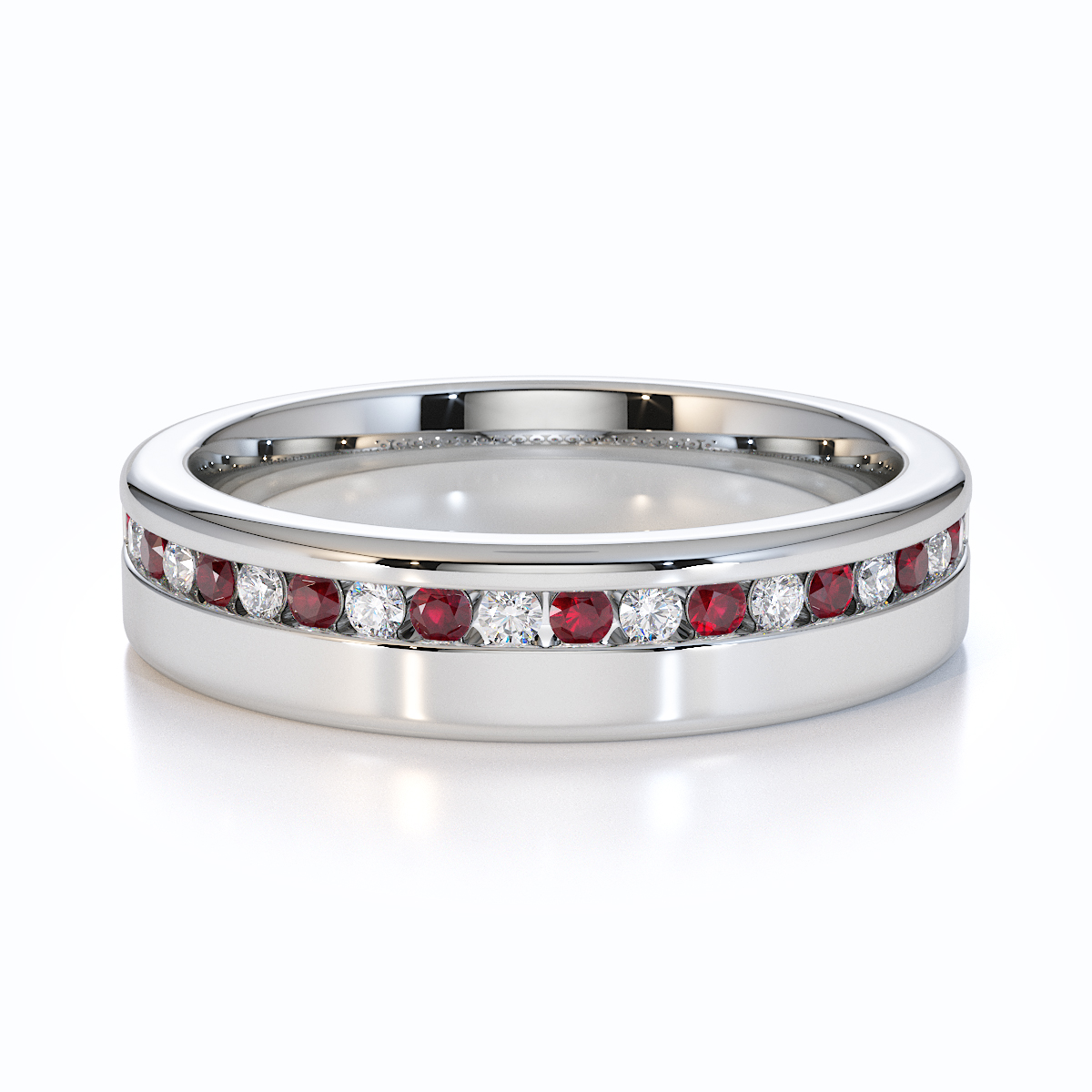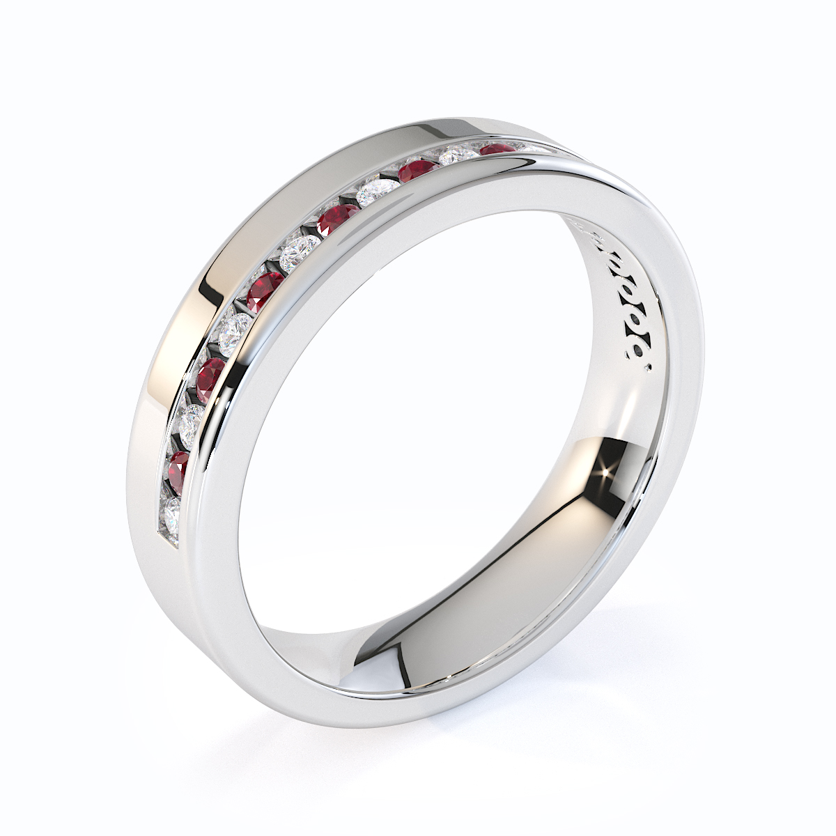 Our eternity ring is a stunning symbol of eternal love and commitment, featuring a half-eternity design of rubies and diamonds. Crafted with precision, the channel setting enhances the brilliance of each gemstone, creating a mesmerizing sparkle. This timeless and luxurious piece is perfect for those seeking a cherished treasure to last forever.