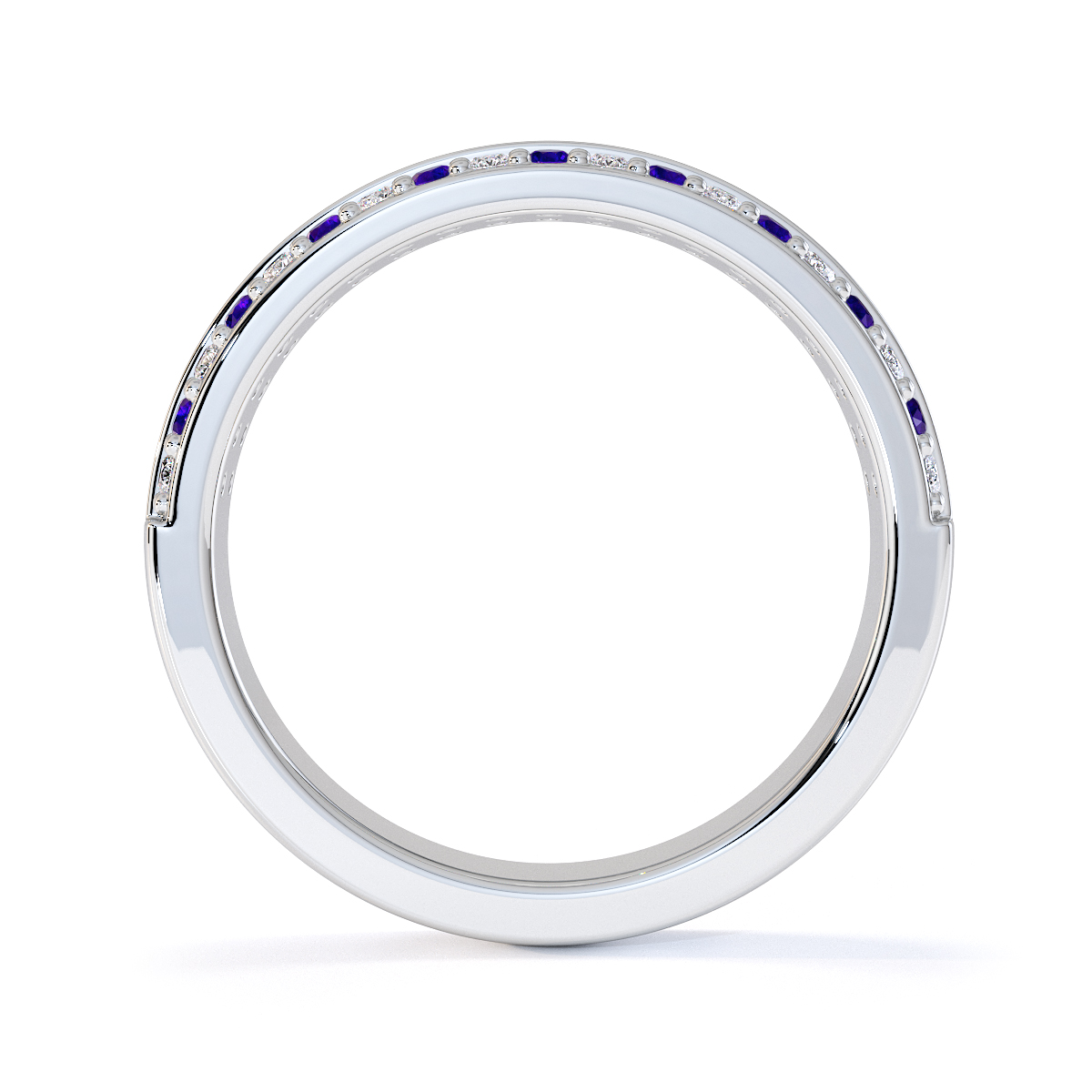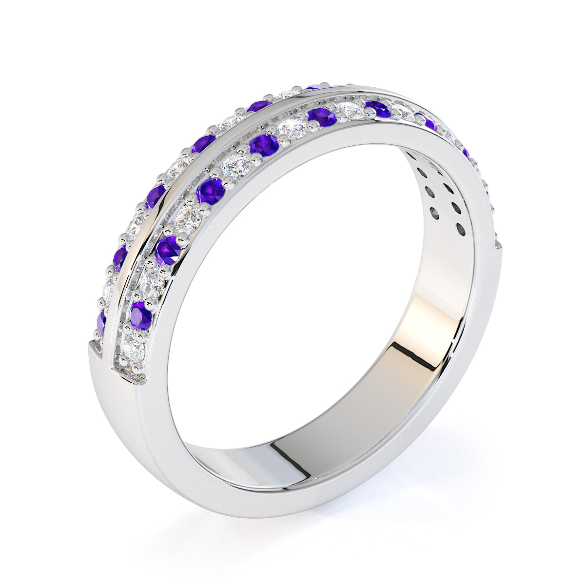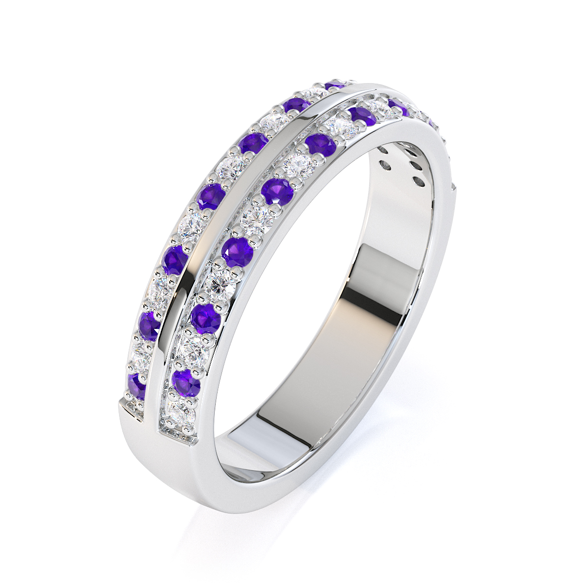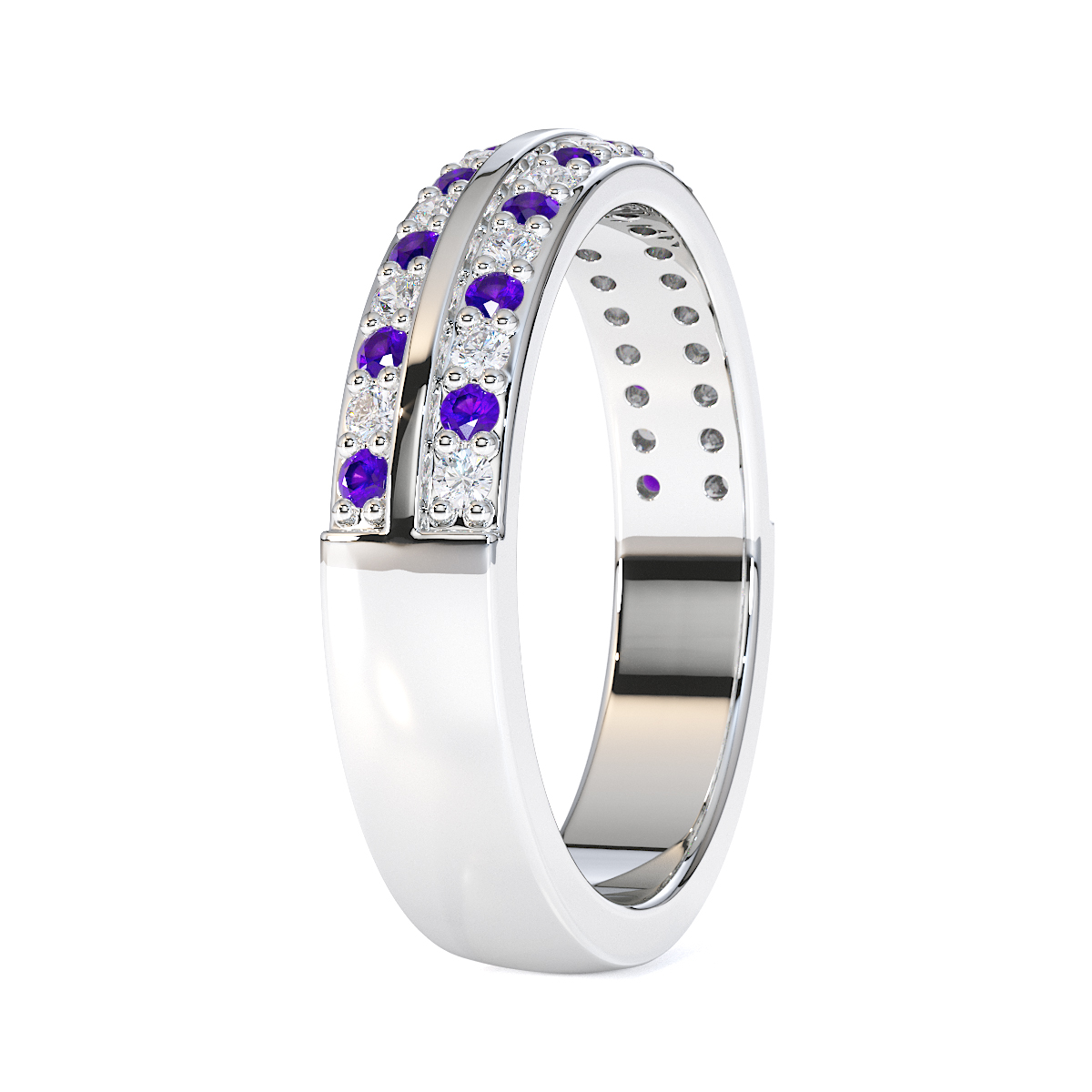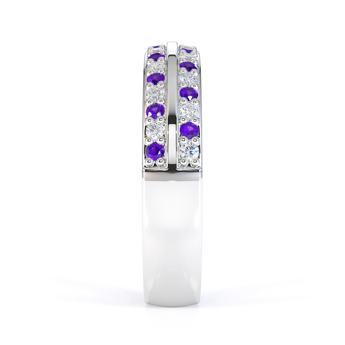 This full-eternity ring, crafted from a blend of amethysts and diamonds, is a stunning accessory that elevates the elegance of any wedding outfit. It’s a timeless piece that symbolises love and dedication, making it an excellent choice for those seeking a distinctive and opulent eternity ring.