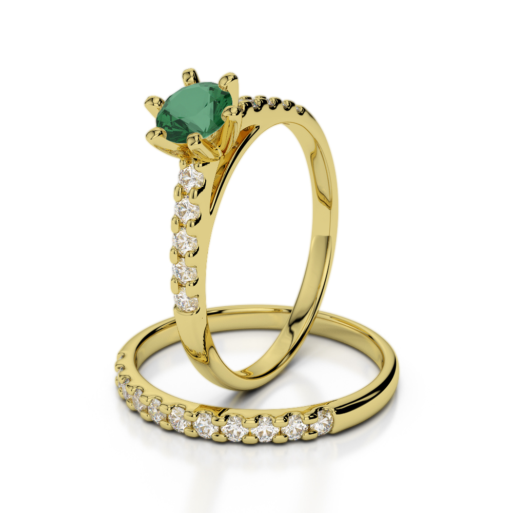 This emerald bridal set is a sophisticated and elegant piece, featuring a brilliant emerald center stone that symbolizes love. The prong setting enhances the diamond's beauty, ensuring it sparkles from every angle, showcasing its beauty.