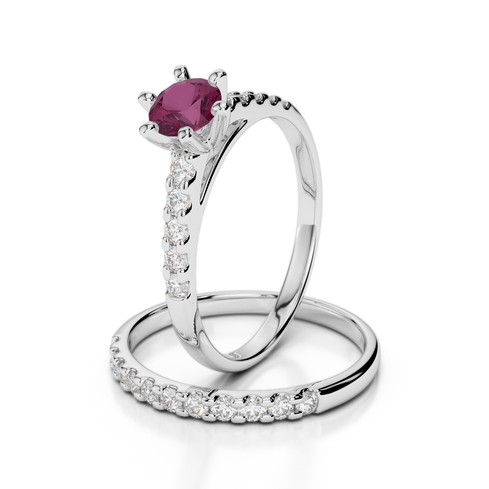 This ruby bridal set is a sophisticated and elegant piece, featuring a brilliant ruby center stone that symbolizes love. The prong setting enhances the diamond's beauty, ensuring it sparkles from every angle, showcasing its beauty.
