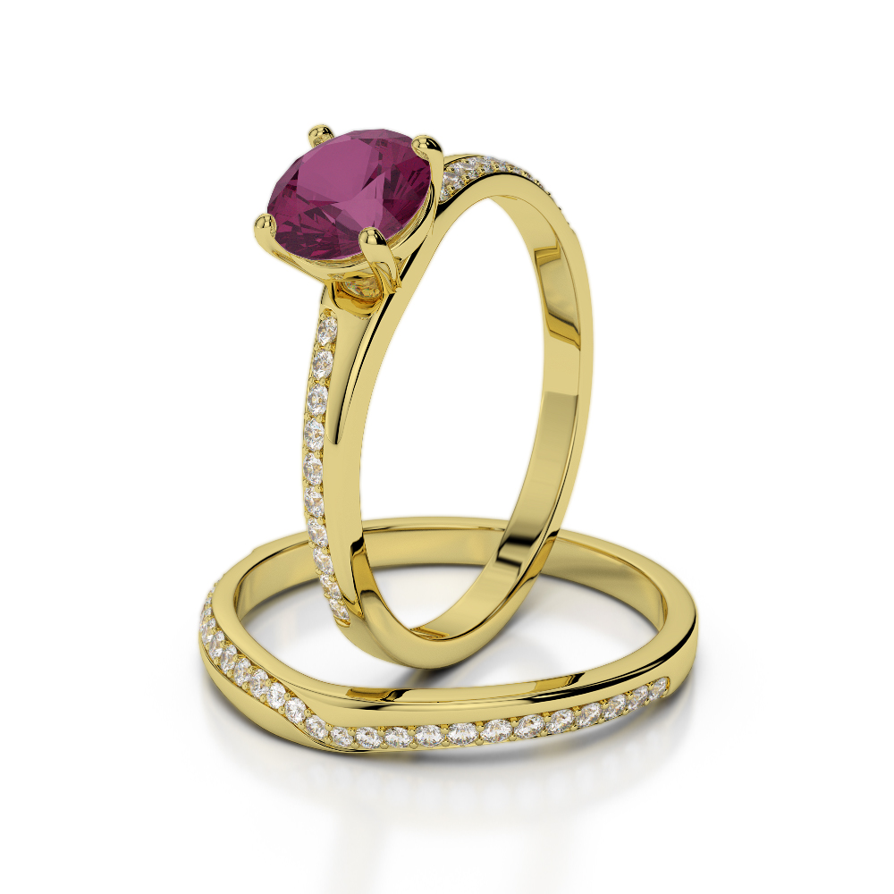 This exquisite ruby bridal set features beautiful stunning wedding rings crafted in gold/platinum and adorned with sparkling diamonds. The rings are elegantly designed with a prong setting, ensuring that the diamonds are securely held in place while allowing maximum light to enhance their brilliance. Perfect for symbolising eternal love and commitment, this set is a timeless and sophisticated choice for any couple's special day.