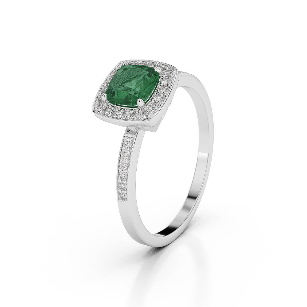This exquisite piece features a prong-set stunning Cushion green emerald at its center, elegantly surrounded by a shimmering halo of sparkling diamonds. The vibrant green hue of the stone is beautifully complemented by the brilliance of the diamonds, creating a luxurious and eye-catching design that is sure to turn heads.