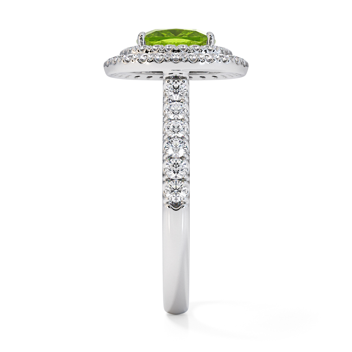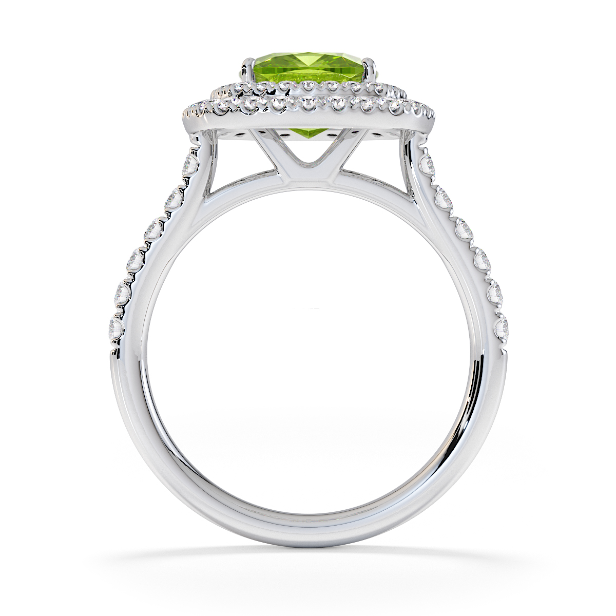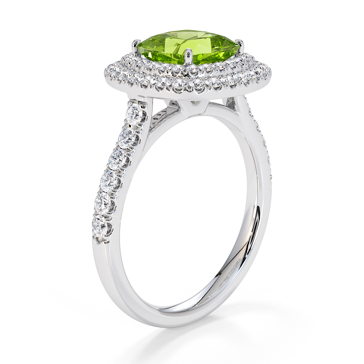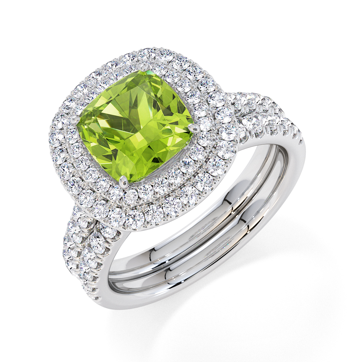 We are presenting our stunning Cushion Cut Peridot and Diamond Engagement Ring, showcasing a double halo design and prong-set stones for exceptional brilliance.