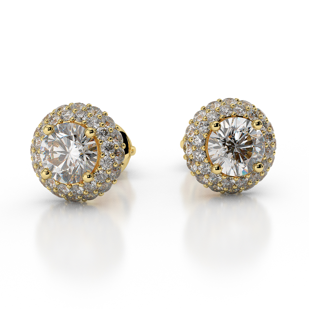 With their round brilliant cut diamonds, these halo earrings are a gorgeous accent to any ensemble. They firmly hold the diamonds in a prong and pave setting, letting the most light possible to accentuate their brilliance. The diamonds are framed by the halo design, which gives a touch of elegance and stunning brightness. Manufactured with great care and accuracy.
