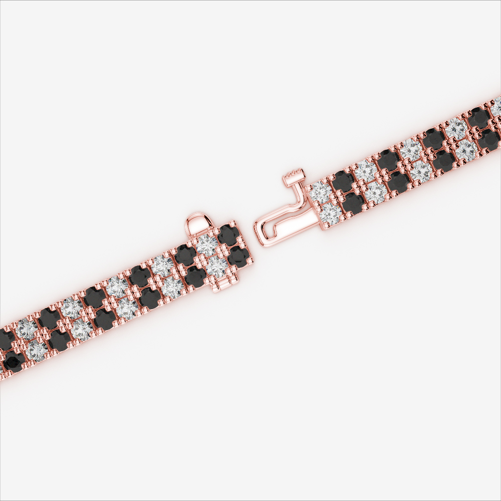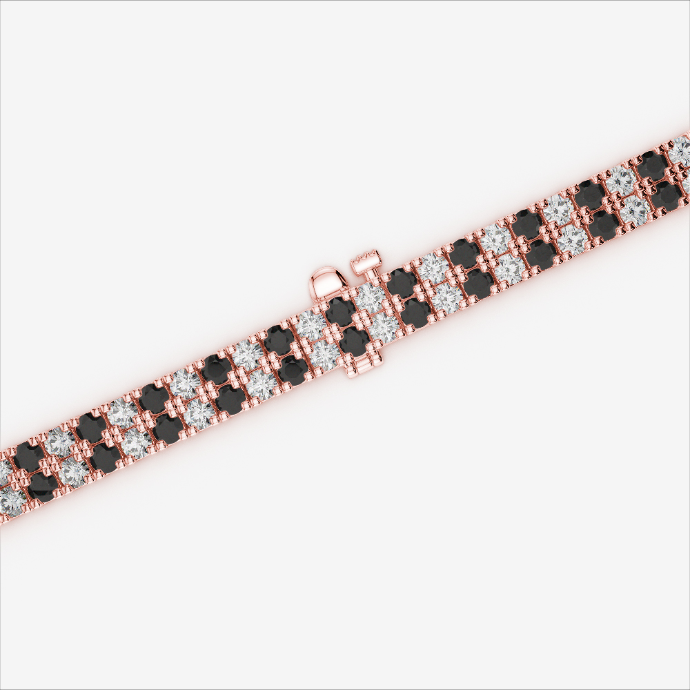 With its graceful composition, the Double Row Prong Set black diamond and diamond bracelet exemplifies formal elegance. Prong-set round-cut stones shine with distinction, making it an impeccable accessory for black-tie events, weddings, or executive occasions. A true celebration of refined artistry.