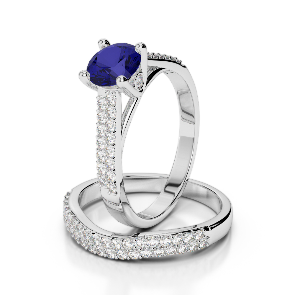 Double Row Prong Set Bridal Set Ring With Diamond & Blue Sapphire 0346