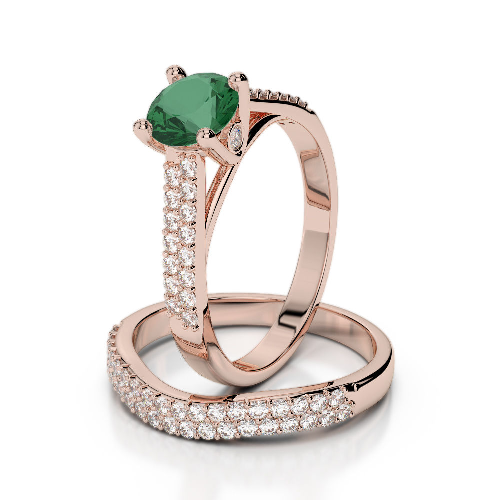 Double Row Prong Set Bridal Set Ring With Diamond & Emerald 0346