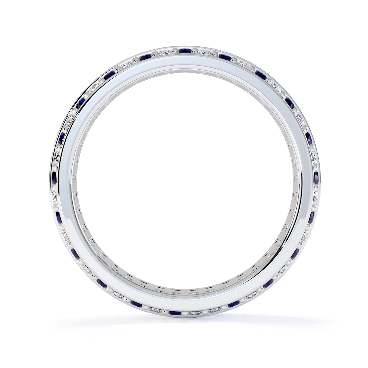 This eternity ring features a stunning combination of blue sapphires and diamonds, with a prong setting for secure placement. Crafted with meticulous attention to detail, it symbolises eternal love and commitment on your special day, ensuring maximum light and brilliance.
