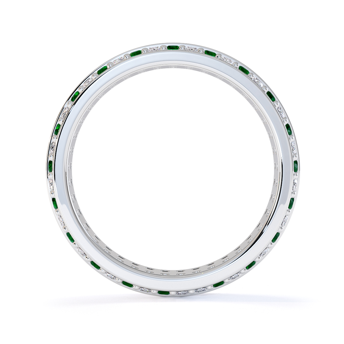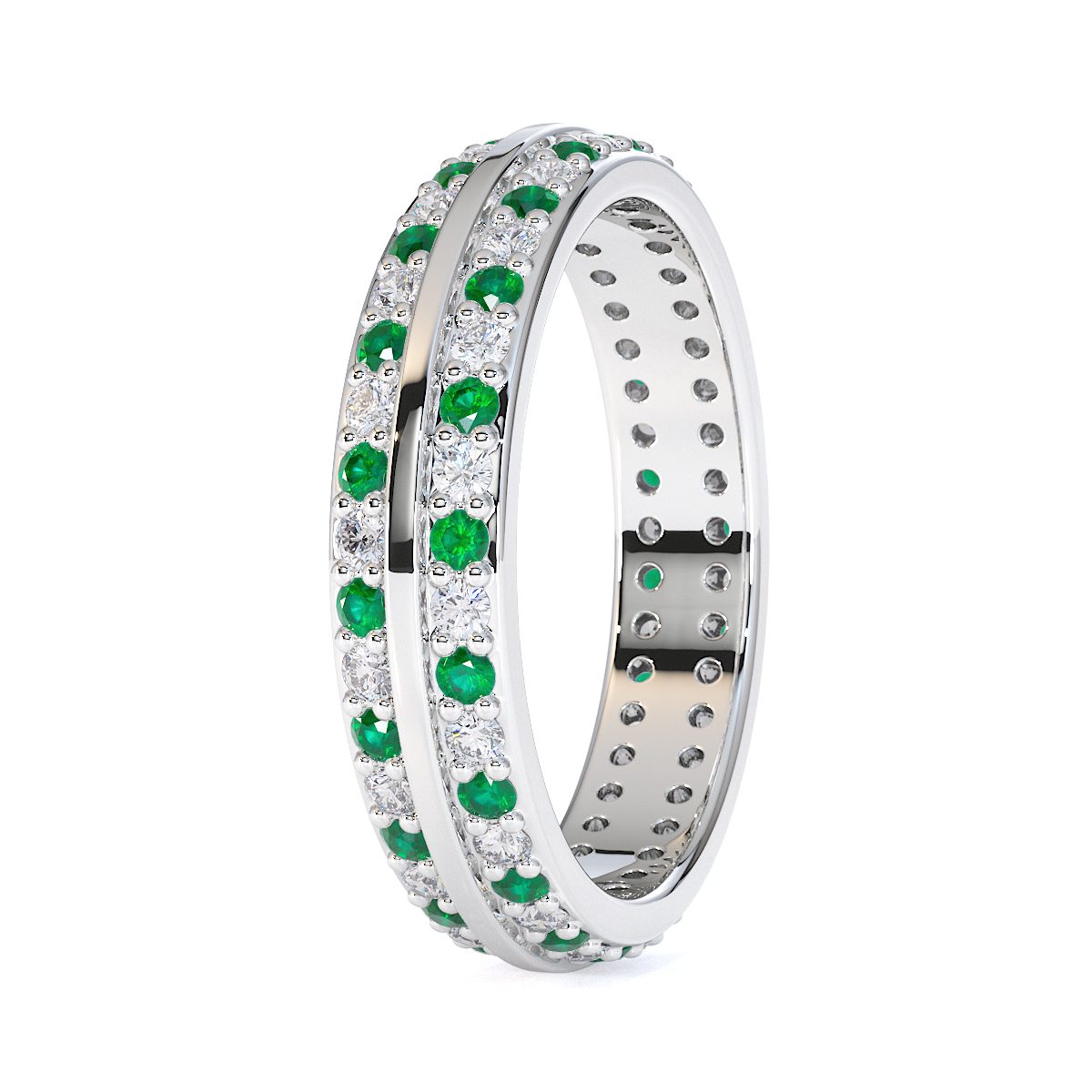 This eternity ring features a stunning combination of emeralds and diamonds, with a prong setting for secure placement. Crafted with meticulous attention to detail, it symbolises eternal love and commitment on your special day, ensuring maximum light and brilliance.