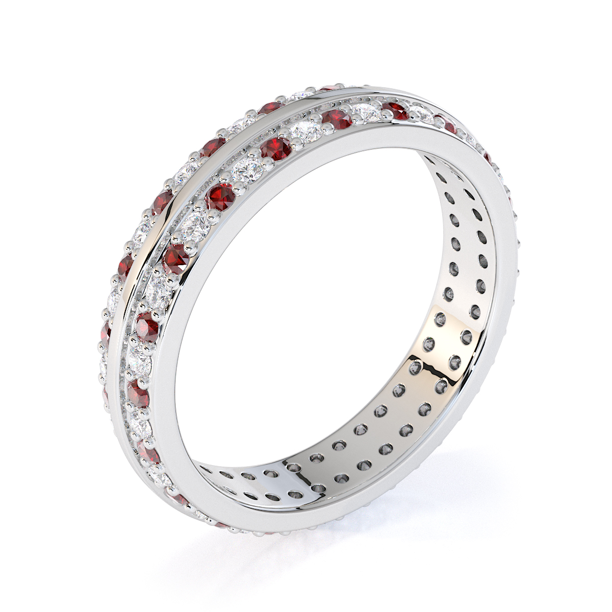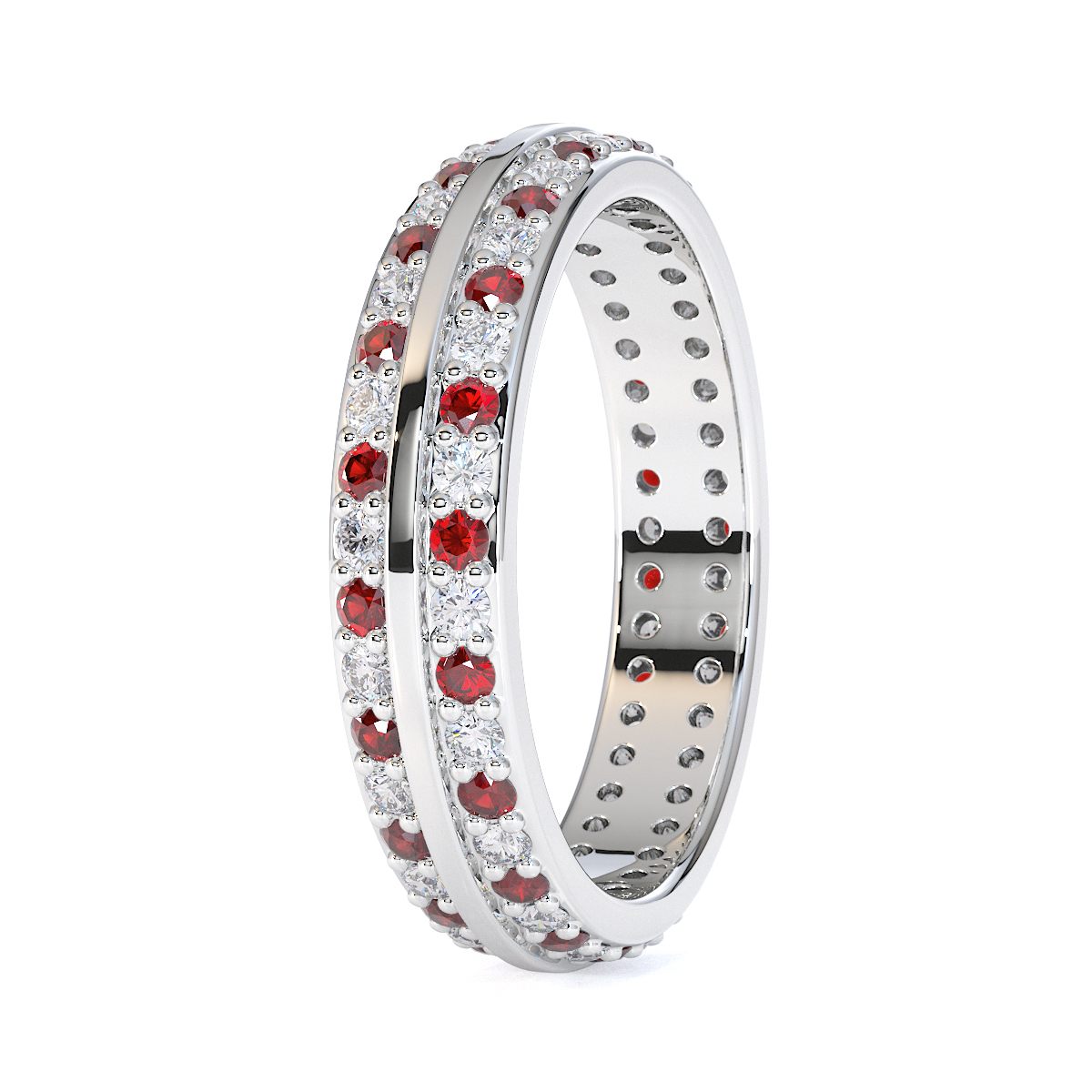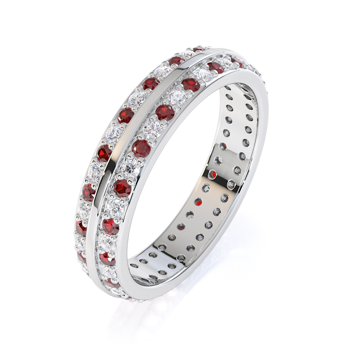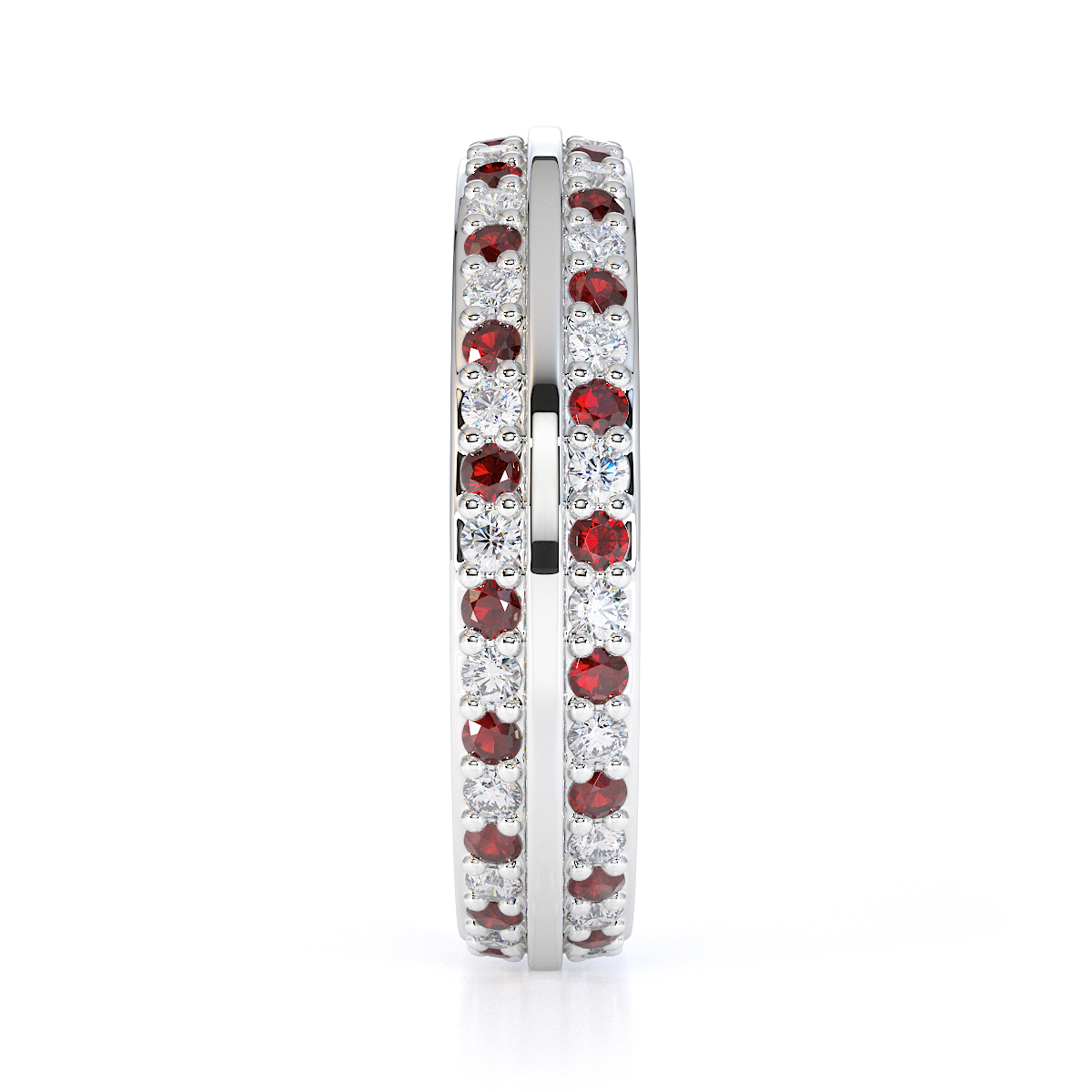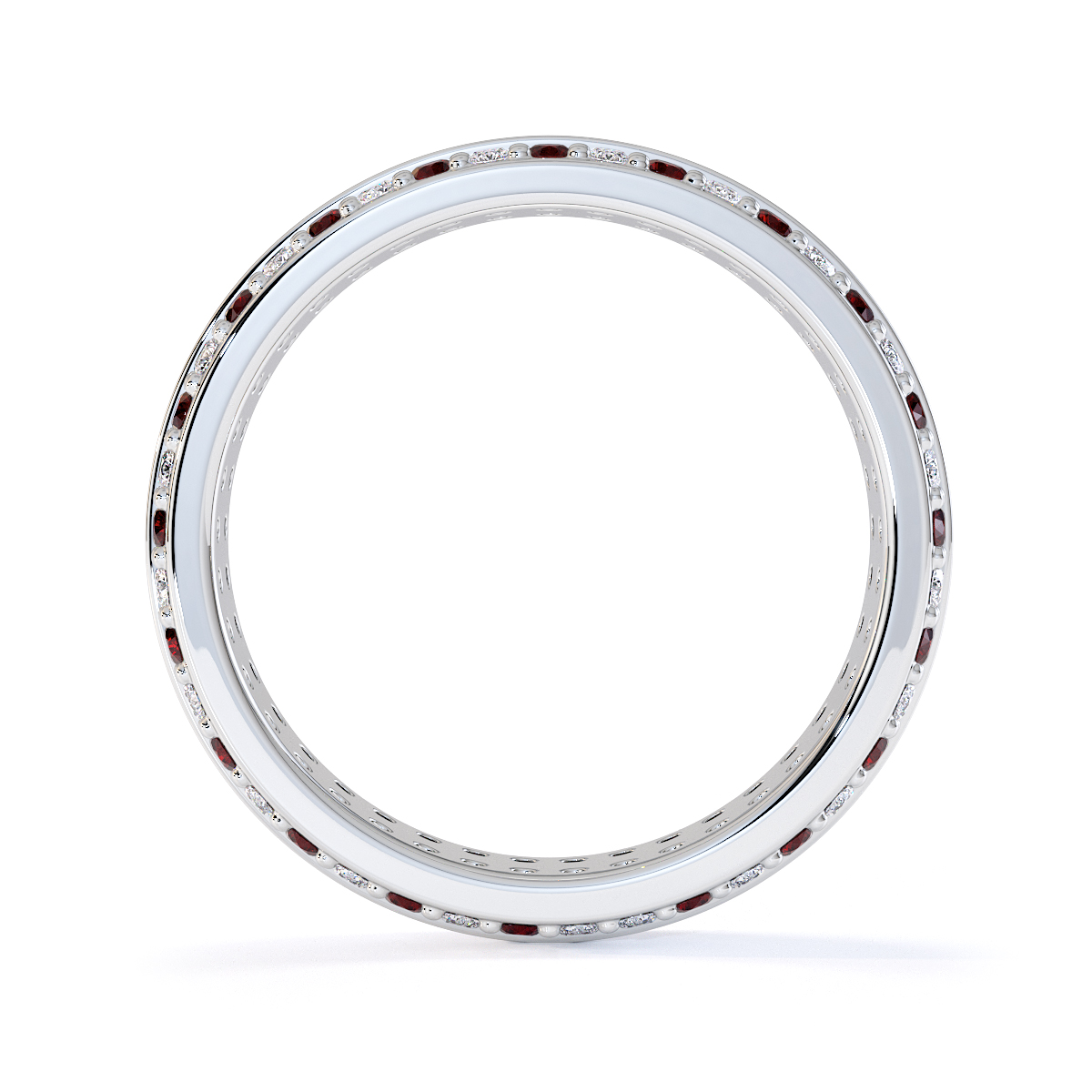 This eternity ring features a stunning combination of garnets and diamonds, with a prong setting for secure placement. Crafted with meticulous attention to detail, it symbolises eternal love and commitment on your special day, ensuring maximum light and brilliance.