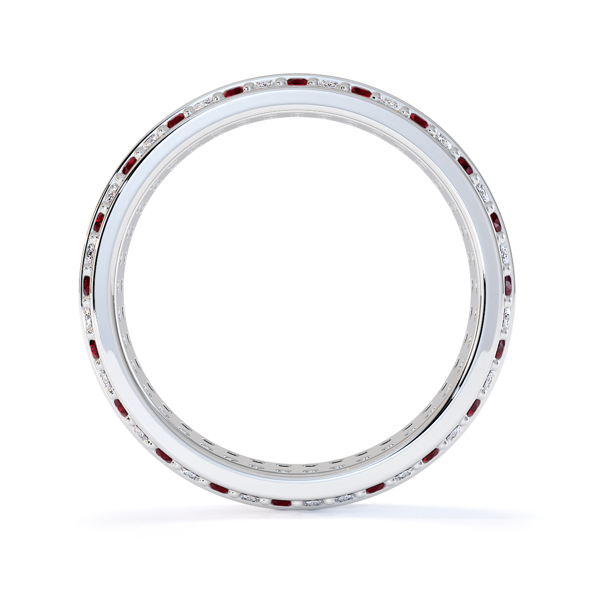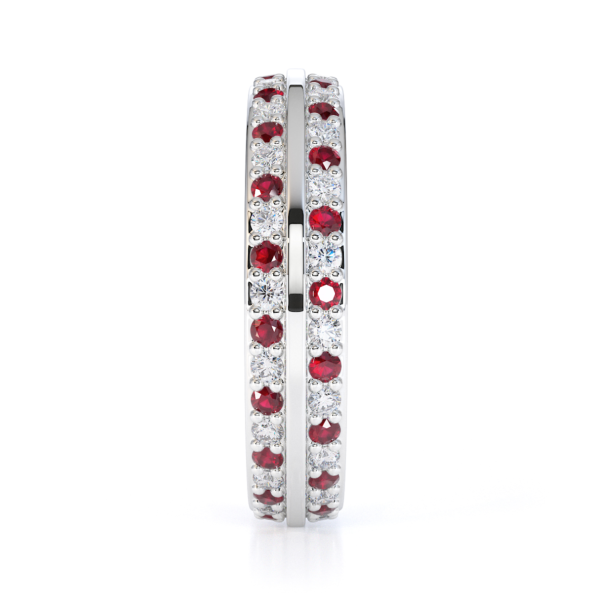 This eternity ring features a stunning combination of rubies and diamonds, with a prong setting for secure placement. Crafted with meticulous attention to detail, it symbolises eternal love and commitment on your special day, ensuring maximum light and brilliance.