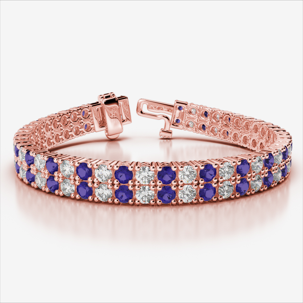 With its graceful composition, the Double Row Prong Set tanzanite and diamond bracelet exemplifies formal elegance. Prong-set round-cut stones shine with distinction, making it an impeccable accessory for black-tie events, weddings, or executive occasions. A true celebration of refined artistry.