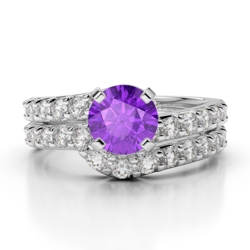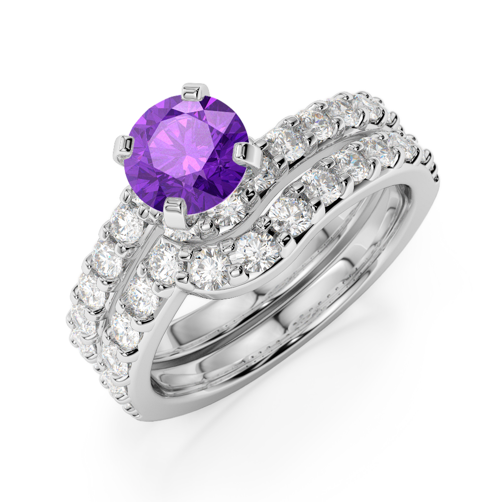 These stunning bridal set rings are a must-have for those who appreciate the sparkle of diamonds. The bridal set features a round brilliant-cut amethyst, further complemented by additional diamonds. The shoulder is also adorned with an array of diamonds. The bridal set seamlessly fits into the wedding ring, creating a stunning effect that provides interest and high impact. The rings are studded with naturally mined, conflict-free diamonds, adding comfort and style to your look.