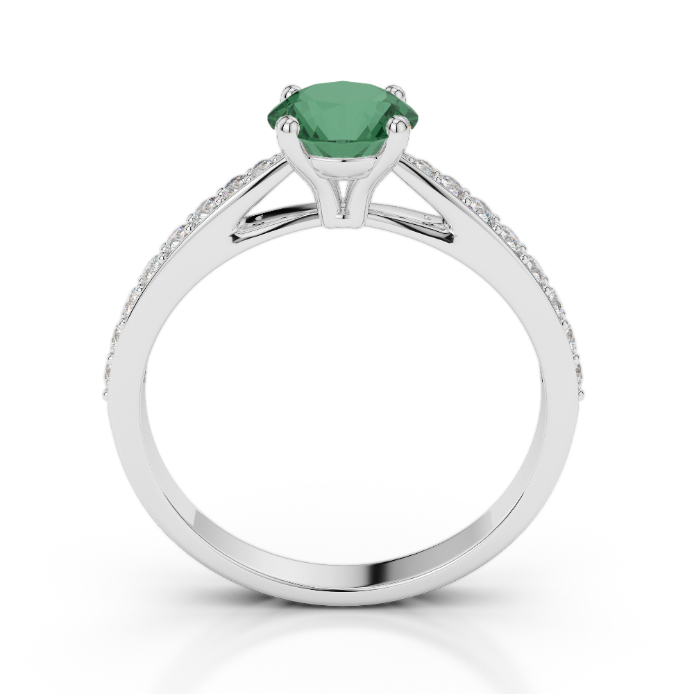 This exquisite Emerald And Diamond Engagement Ring features a stunning round brilliant cut diamond in a classic prong setting, allowing light to enter from every angle for maximum sparkle. Renowned for its brilliance and fire, the diamond takes center stage in this elegant symbol of everlasting love.
