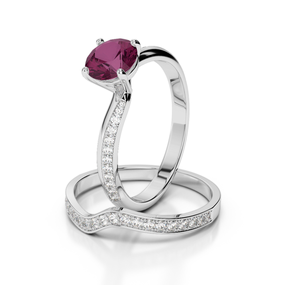 This beautiful ruby bridal set includes beautiful gorgeous wedding rings that are embellished with diamonds on the sides. The rings have a graceful design with a prong setting, which ensures that the diamonds are held securely while also allowing light to enhance their sparkle. Created with great care and precision, this set radiates timeless elegance and represents the everlasting connection between beautiful individuals. Ideal for those in search of a refined and glamorous wedding ring set, this piece will undoubtedly attract attention when worn by any bride.