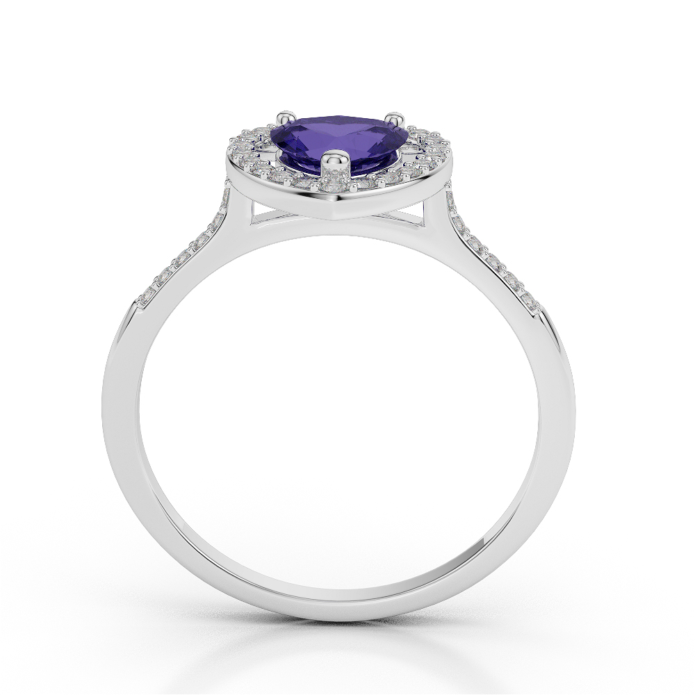 This tanzanite heart-shaped ring, prong-set and adorned with diamonds, is a symbol of elegance and sophistication, crafted with precision and attention to detail. The heart-shaped sapphire symbolises love and affection, while a halo of dazzling diamonds surrounds it, enhancing its brilliance and creating a mesmerising sparkle.