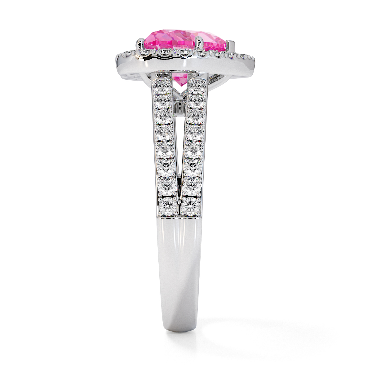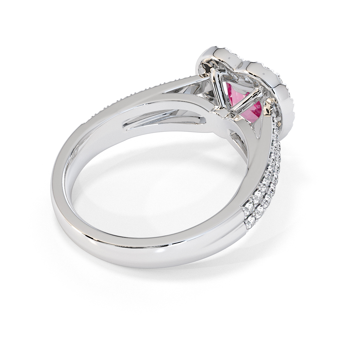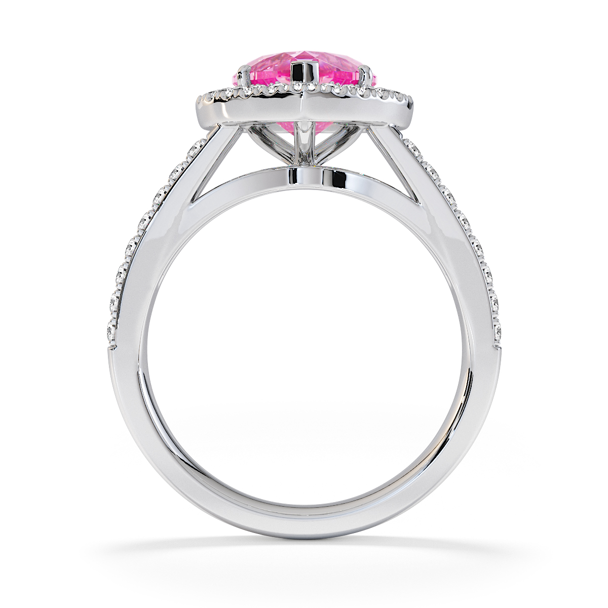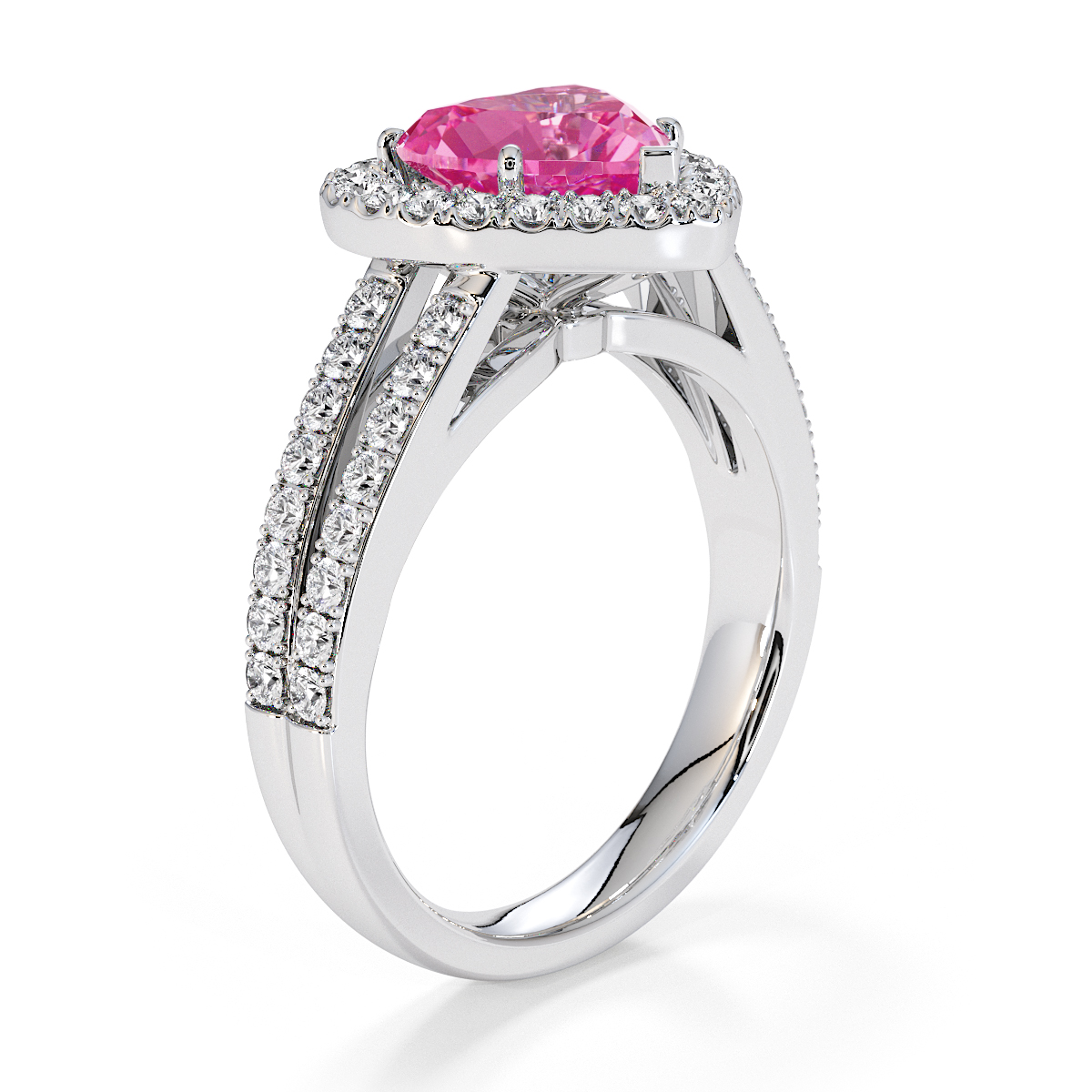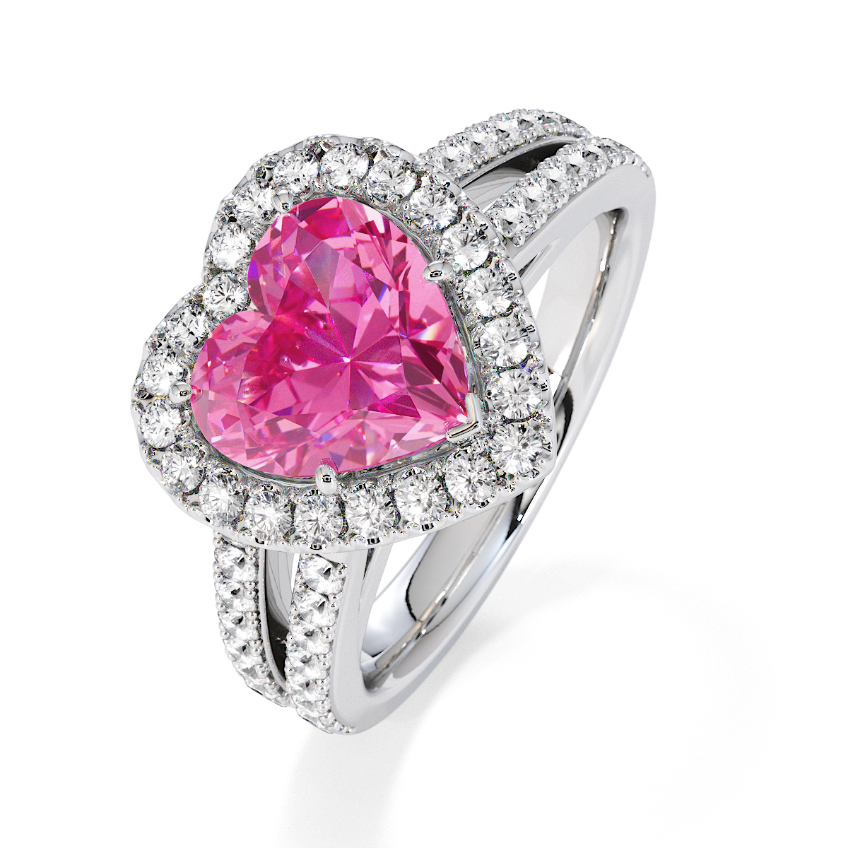 We are presenting our stunning Heart cut Pink Sapphire and Diamond Engagement Ring, featuring a sparkling halo of round-cut diamonds delicately set in prongs.