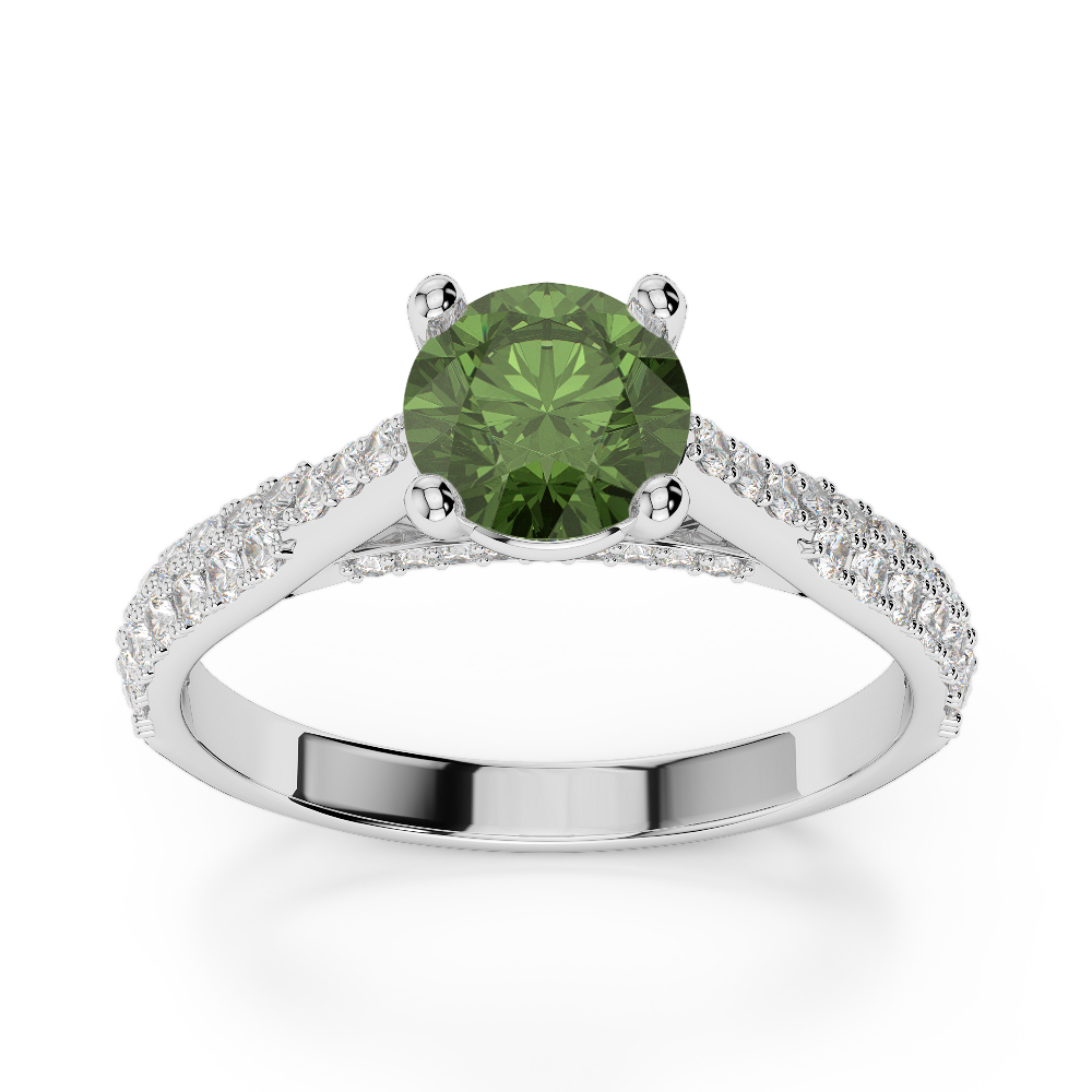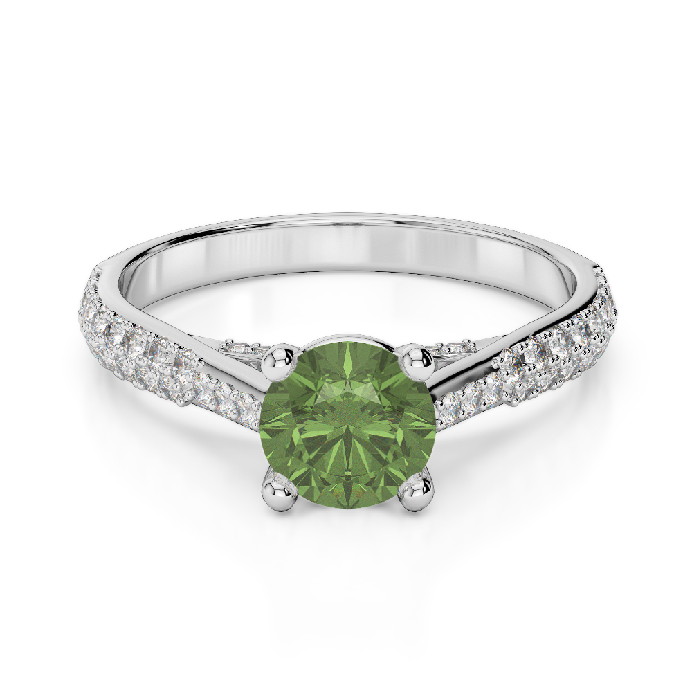 This exquisite Green Tourmaline And Diamond Engagement Ring features a stunning round brilliant cut diamond, expertly set in a classic prong setting to maximize its brilliance and sparkle. The prongs securely cradle the diamond while allowing optimal light exposure, enhancing its exceptional fire and clarity. As the radiant centerpiece of this timeless piece, the diamond beautifully symbolizes the eternal love and commitment shared between partners.