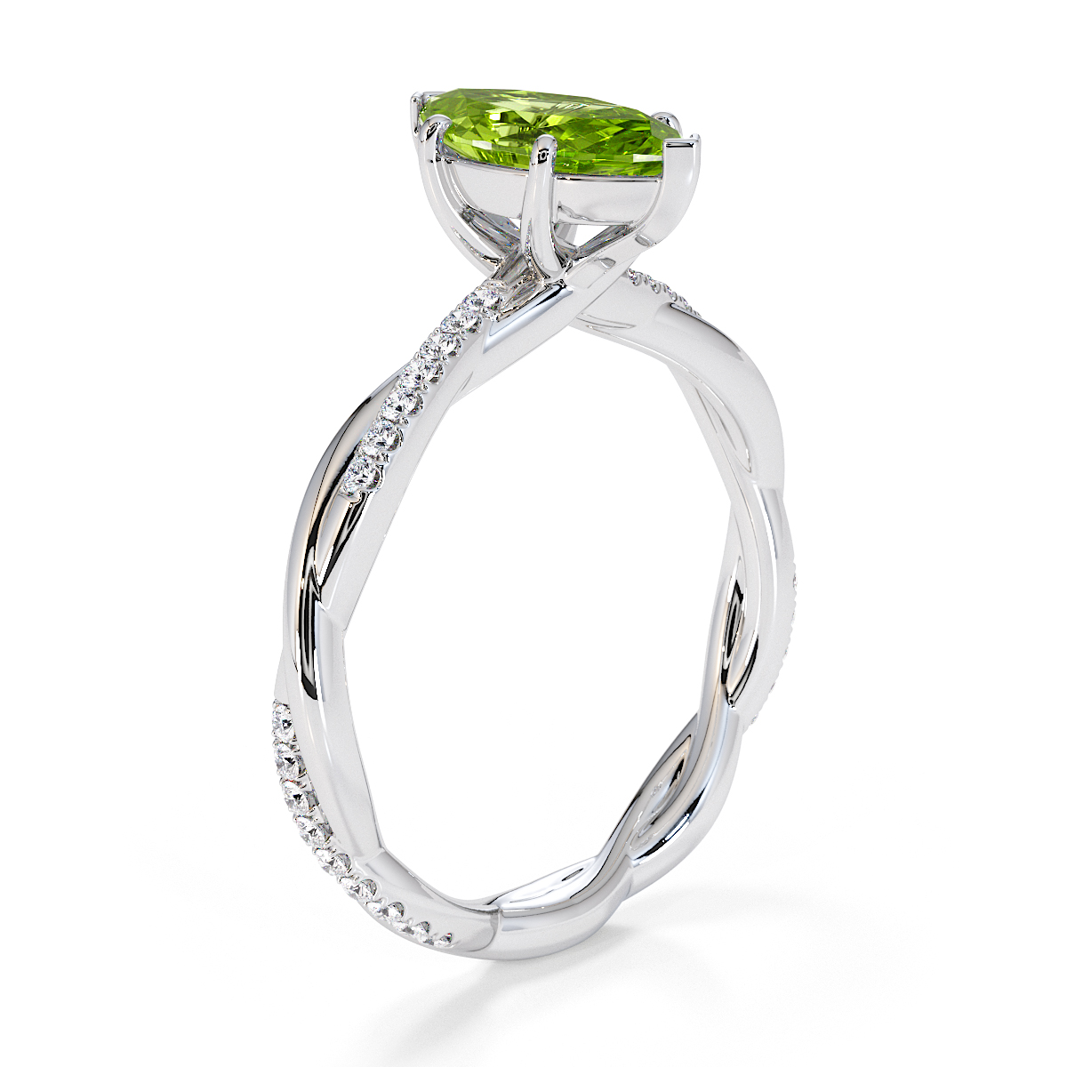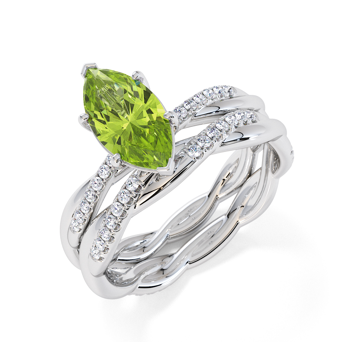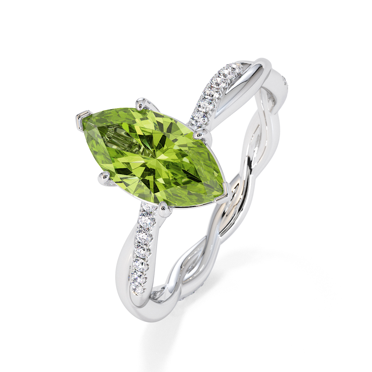 Presenting our stunning Marquise Cut Peridot and Diamond Engagement Ring. The ring is further adorned with prong-set diamonds running up the twisted shoulders. It perfectly complements the wedding ring of your choice.