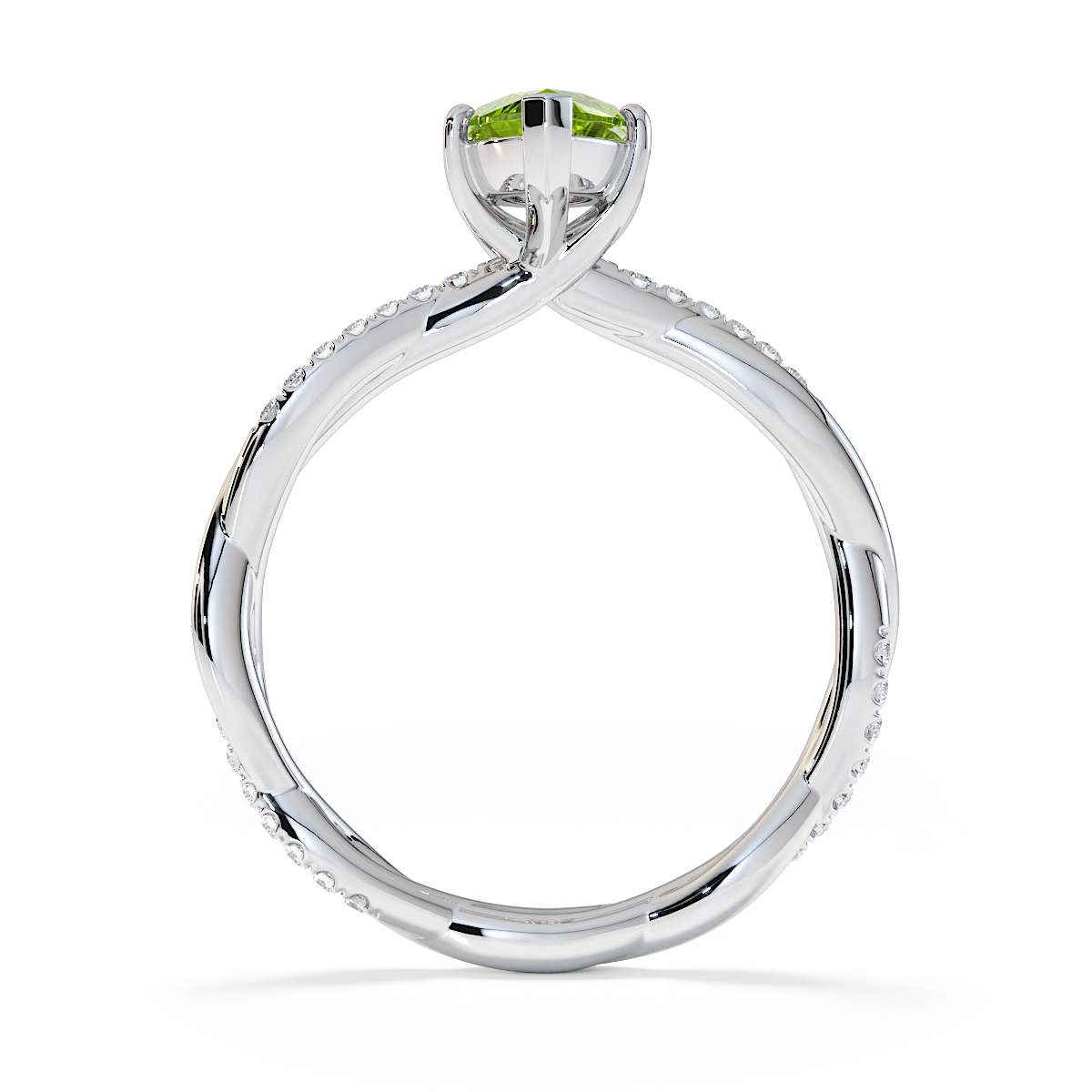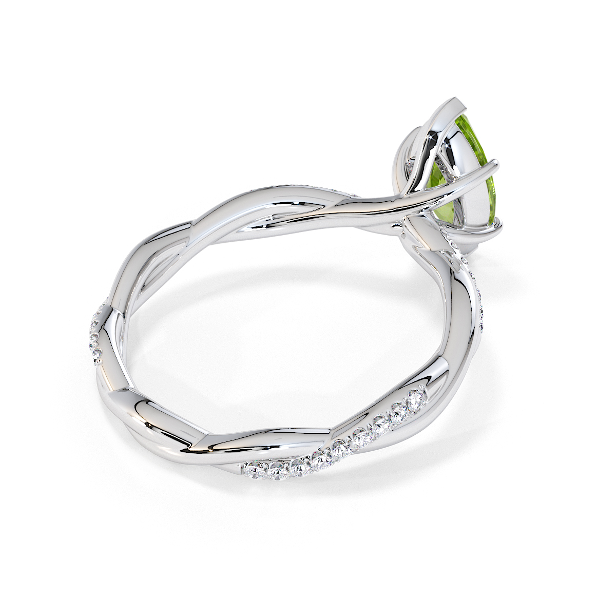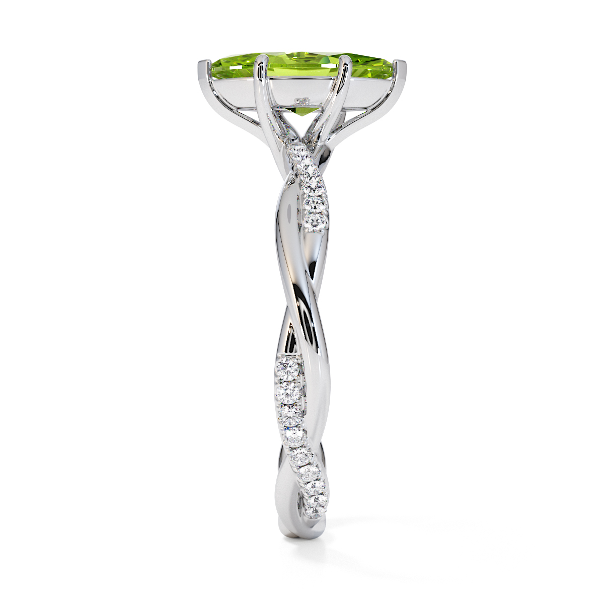 Presenting our stunning Marquise Cut Peridot and Diamond Engagement Ring. The ring is further adorned with prong-set diamonds running up the twisted shoulders. It perfectly complements the wedding ring of your choice.