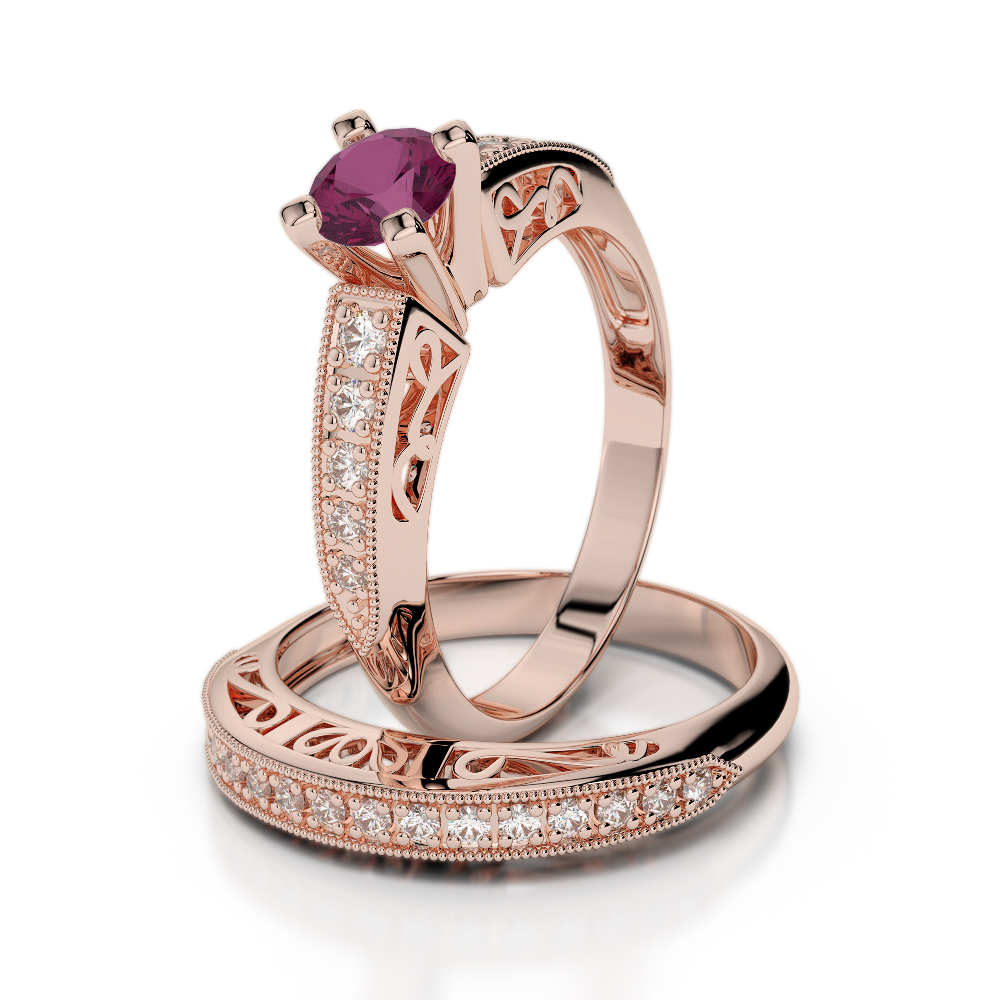 Milgrain Prong Set Diamond and Ruby Bridal Set Ring 0315