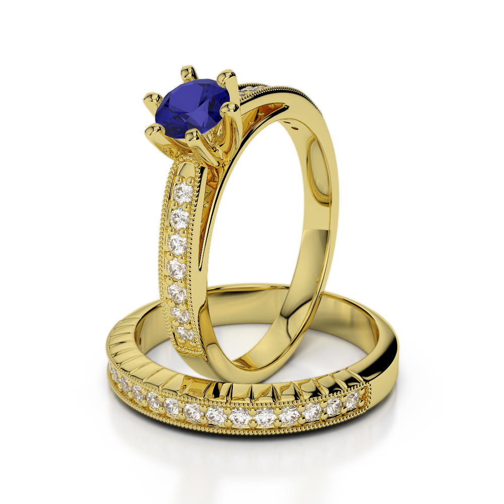 Milgrain Round Cut Blue Sapphire & Diamond Bridal Set Ring 0309