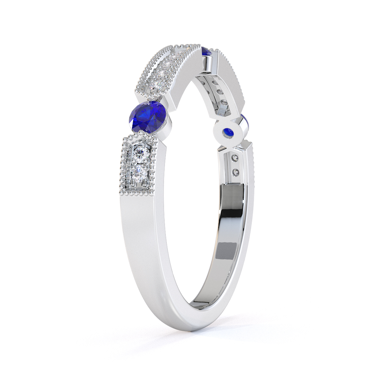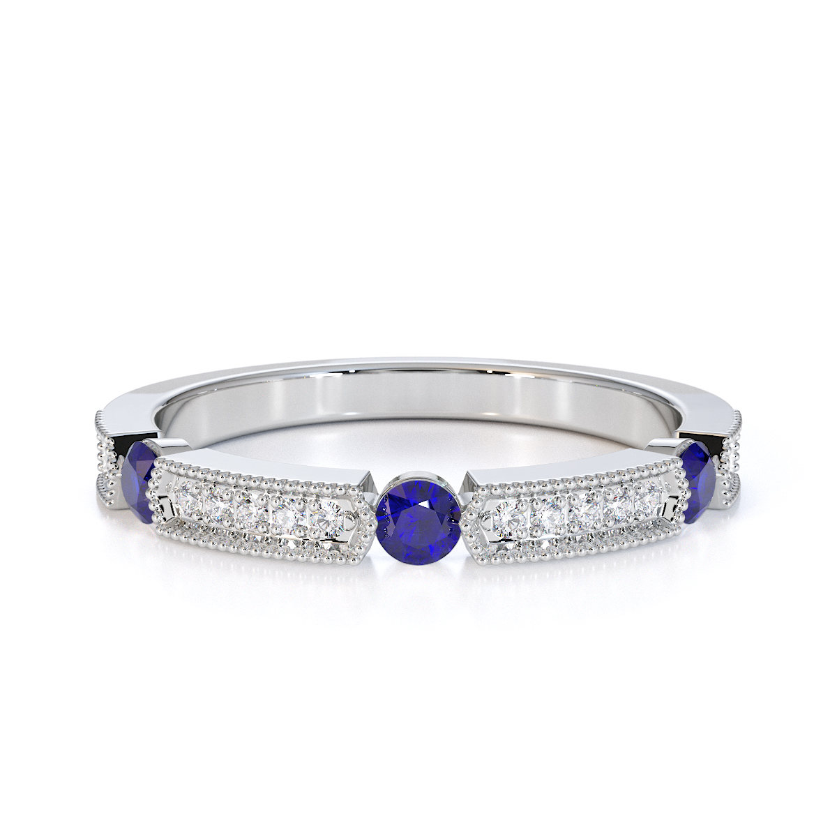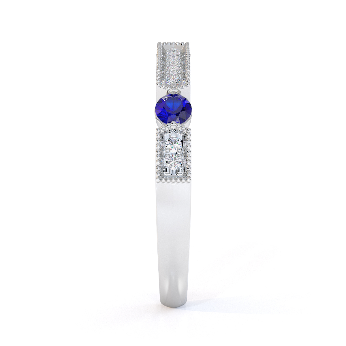 Milgrain Round Cut Diamond and Blue Sapphire Half Eternity Ring 0425