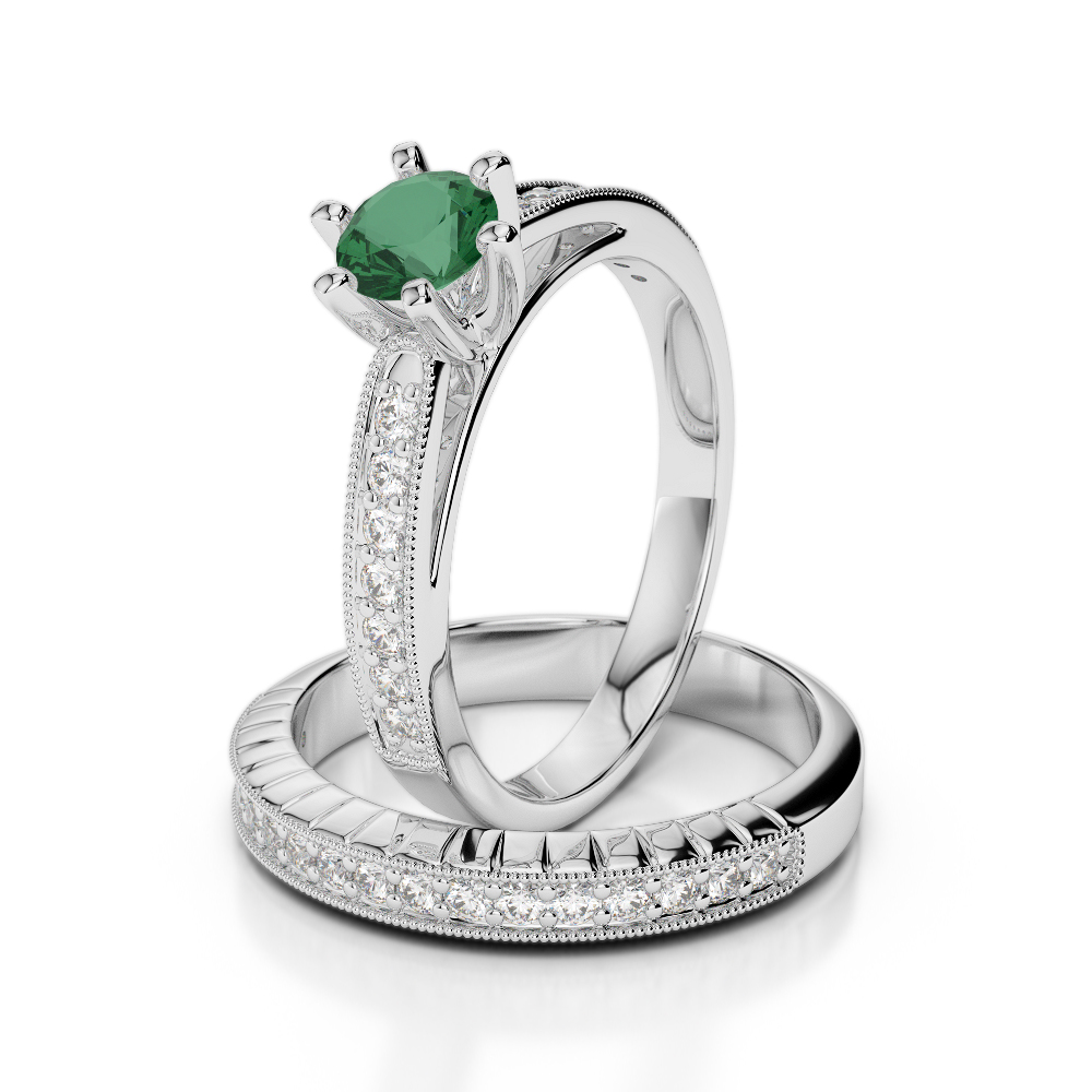 Milgrain Round Cut Emerald & Diamond Bridal Set Ring 0309