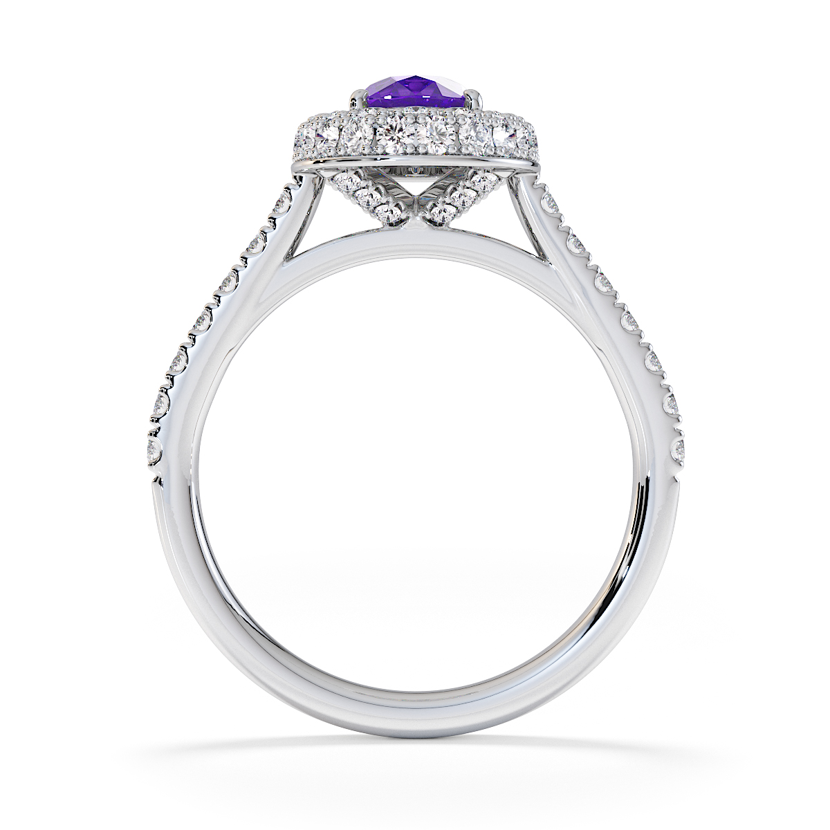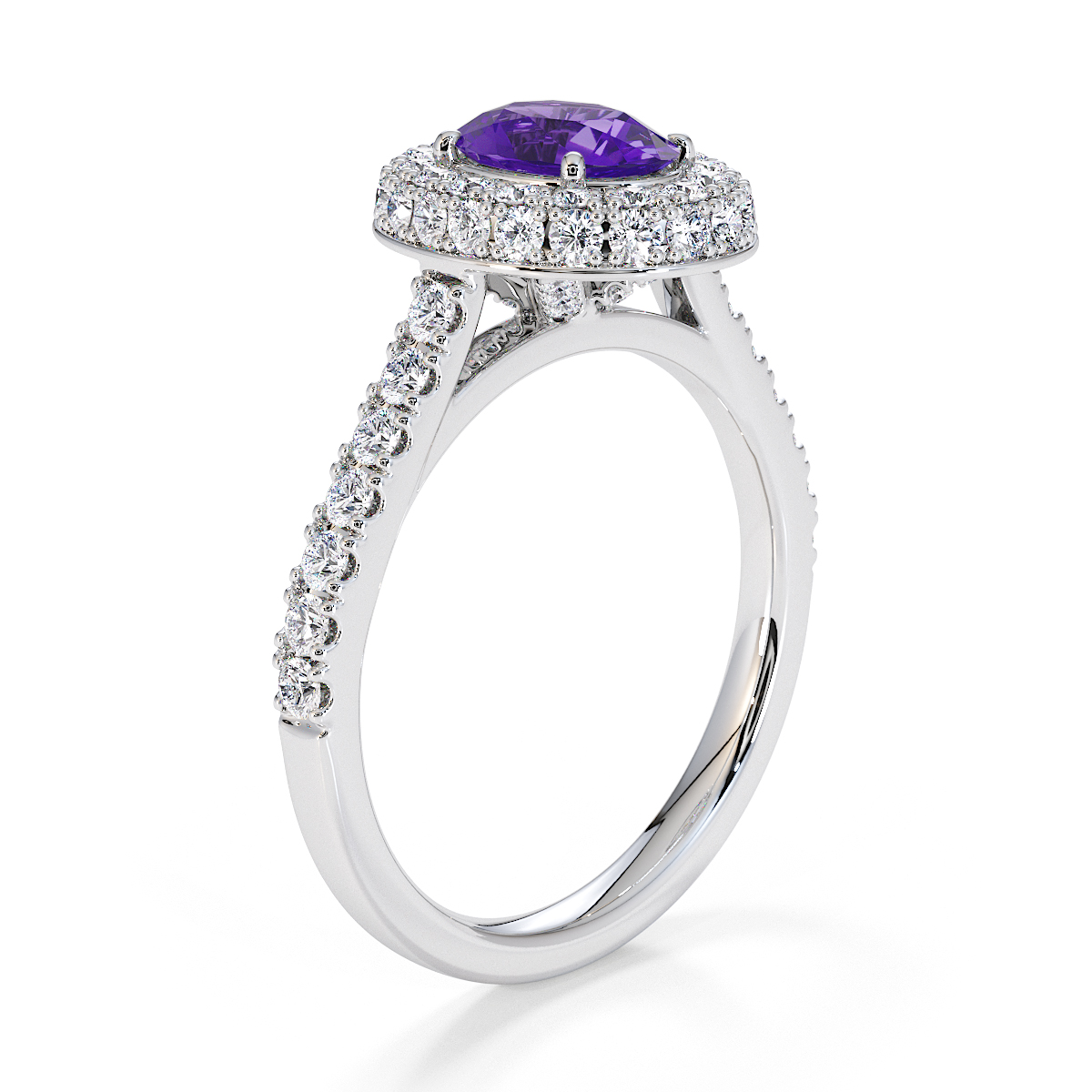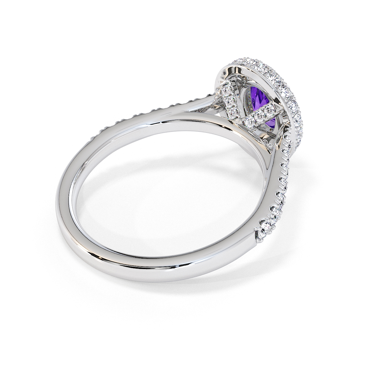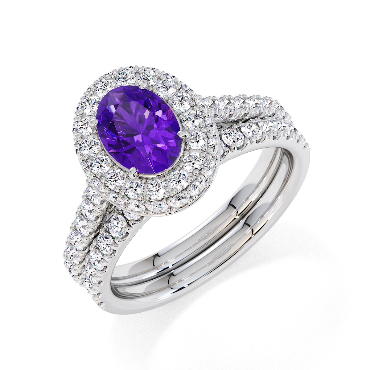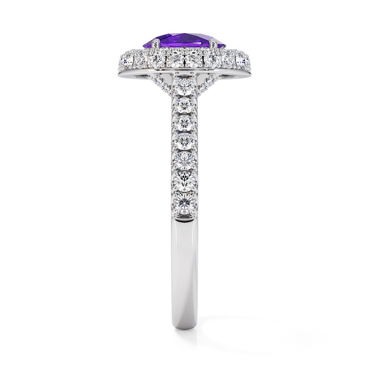 Featuring a gorgeous oval-shaped Amethyst and Diamond Engagement Ring, surrounded by a halo of round brilliant stones, The ring is further adorned with prong-set diamonds running up the shoulders. This engagement ring sits beautifully with the wedding ring of your choice.