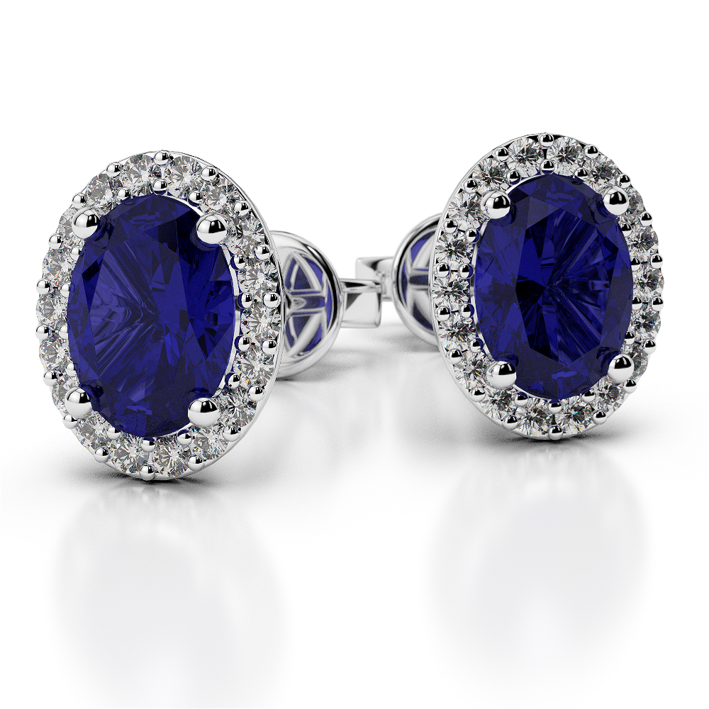 Oval Shape Blue Sapphire & Round Cut Diamond Earrings 0477
