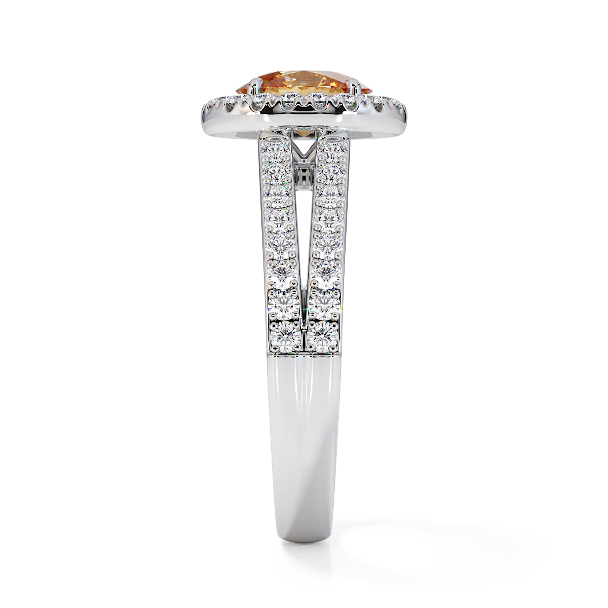 Featuring a gorgeous oval-shaped Citrine and Diamond Engagement Ring surrounded by a halo of round brilliant stones, the ring is further adorned with prong-set diamonds running up the split shank shoulders. This engagement ring beautifully complements the wedding ring of your choice.